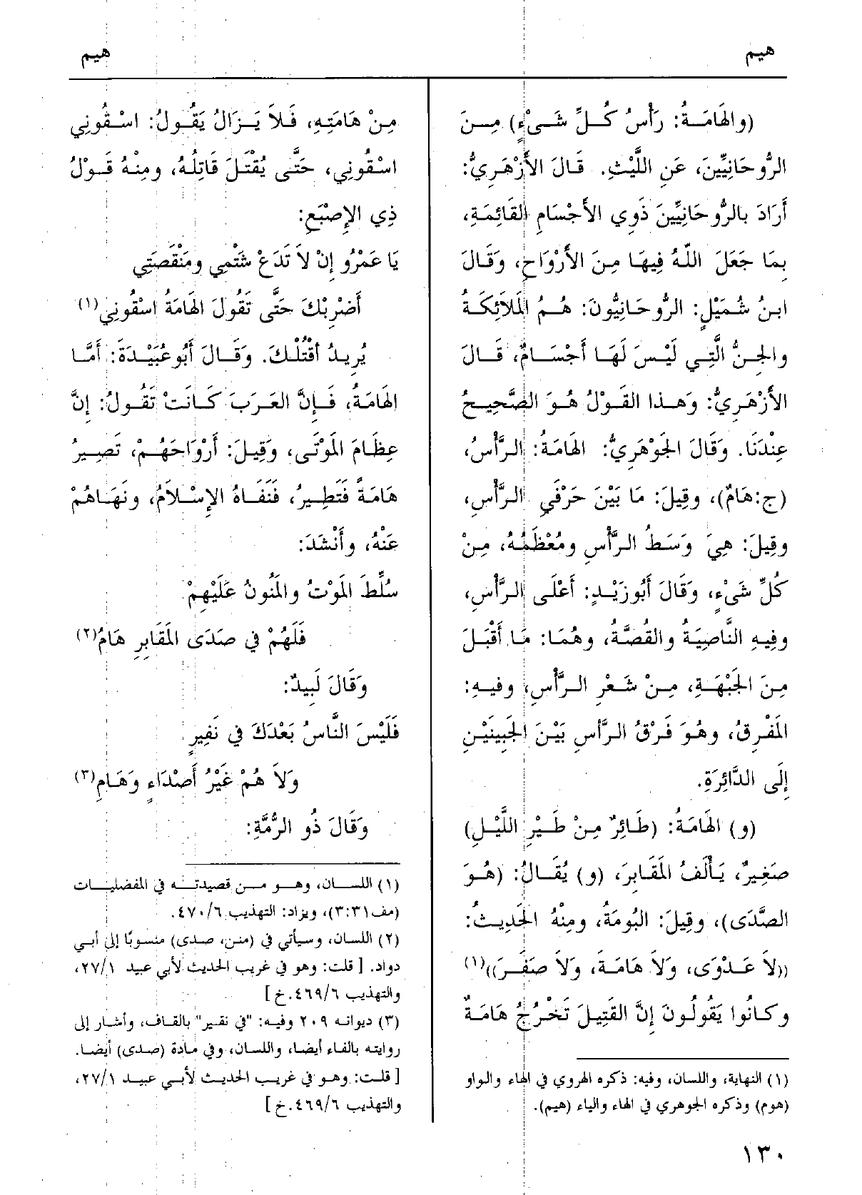 ( {والهَامَةُ: رأسُ كُلِّ شَيْء) مِنَ الرُّوحَانِيِّينَ، عنِ اللَّيْثِ. قالَ الأزْهَرِيُّ: أرَادَ بالرُّوحَانِيِّينَ ذَوِي الأَجْسَامِ القَائِمَةِ، بِمَا جَعَلَ اللهُ فِيهَا مِنَ الأرْوَاحِ، وقالَ ابنُ شُمَيْلٍ: الرُّوحَانِيُّونَ: هُمُ المَلاَئِكَةُ والجِنُّ التِي لَيْسَ لَهَا أجْسَامٌ، قالَ الأزْهَرِيُّ: وَهَذَا القَوْلُ هُوَ الصَّحِيحُ عِنْدَنَا. وقالَ الجَوْهَرِيُّ:} الهَامَةُ: الرَّأْسُ، (ج: {هَامٌ) ، وقيلَ: مَا بَيْنَ حَرْفَيِ الرَّأْسِ، وقِيلَ: هِيَ وَسَطُ الرَّأْسِ ومُعْظَمُهُ، مِنْ كُلِّ شَيْءٍ، وقَالَ أبُو زَيْدٍ: أعْلَى الرَّأْسِ، وفِيه النَّاصِيَةُ والقُصَّةُ، وهُمَا: مَا أقْبَلَ منَ الجَبْهَةِ، مِنْ شَعْرِ الرَّأْسِ، وفيهِ: المَفْرِقُ، وهُوَ فَرْقُ الرَّأسِ بَيْنَ الجَبِينَيْنِ إِلَى الدّائِرَةِ. (و) الهَامَةُ: (طَائِرٌ من طَيْرِ اللَّيْلِ) صَغِيرٌ، يَأْلَفُ المَقَابِرَ، (و) يُقَالُ: (هُوَ الصَّدَى) ، وقِيلَ: البُومَةُ، ومِنْهُ الحَدِيثُ: " لَا عَدْوَى، وَلاَ} هَامَةَ، وَلاَ صَفَرَ " وكانُوا يَقُولُونَ إنَّ القَتِيلَ تَخْرُجُ هَامَةٌ من {هَامَتِهِ، فَلاَ يَزَالُ يَقُولُ: اسْقُونِي اسْقُونِي، حَتَّى يُقْتَلَ قَاتِلُهُ، ومِنْهُ قَوْلُ ذِي الإِصْبَعِ: