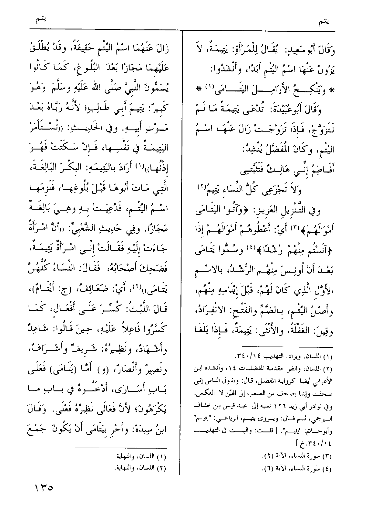 وَفِي التَنْزِيلِ العَزِيزِ: {وَآتوا الْيَتَامَى أَمْوَالهم} أيْ: أَعْطُوهُمْ أمْوَالَهُمْ إِذَا {آنستم مِنْهُم رشدا} وسُمُّوا {يَتَامَى بَعْدَ أنْ أُونِسَ مِنْهُم الرُّشْدُ، بالاسْمِ الأَوِّلِ الذِي كانَ لَهُمْ، قَبْلَ إيْنَاسِهِ مِنْهُم، وأَصْلُ اليُتْمِ، بِالضَّمِّ والفَتْحِ: الانْفِرادُ، وقِيلَ: الغَفْلَةُ، والأُنْثَى: يَتِيمَةٌ، فَإذَا بَلَغَا زَالَ عَنْهُمَا اسْمُ اليُتْمِ حَقِيقَةً، وقَدْ يُطْلَقُ عَلَيْهِمَا مَجَازاً بَعْدَ البُلُوغِ، كَمَا كَانُوا يُسَمُّونَ النَّبِيَّ