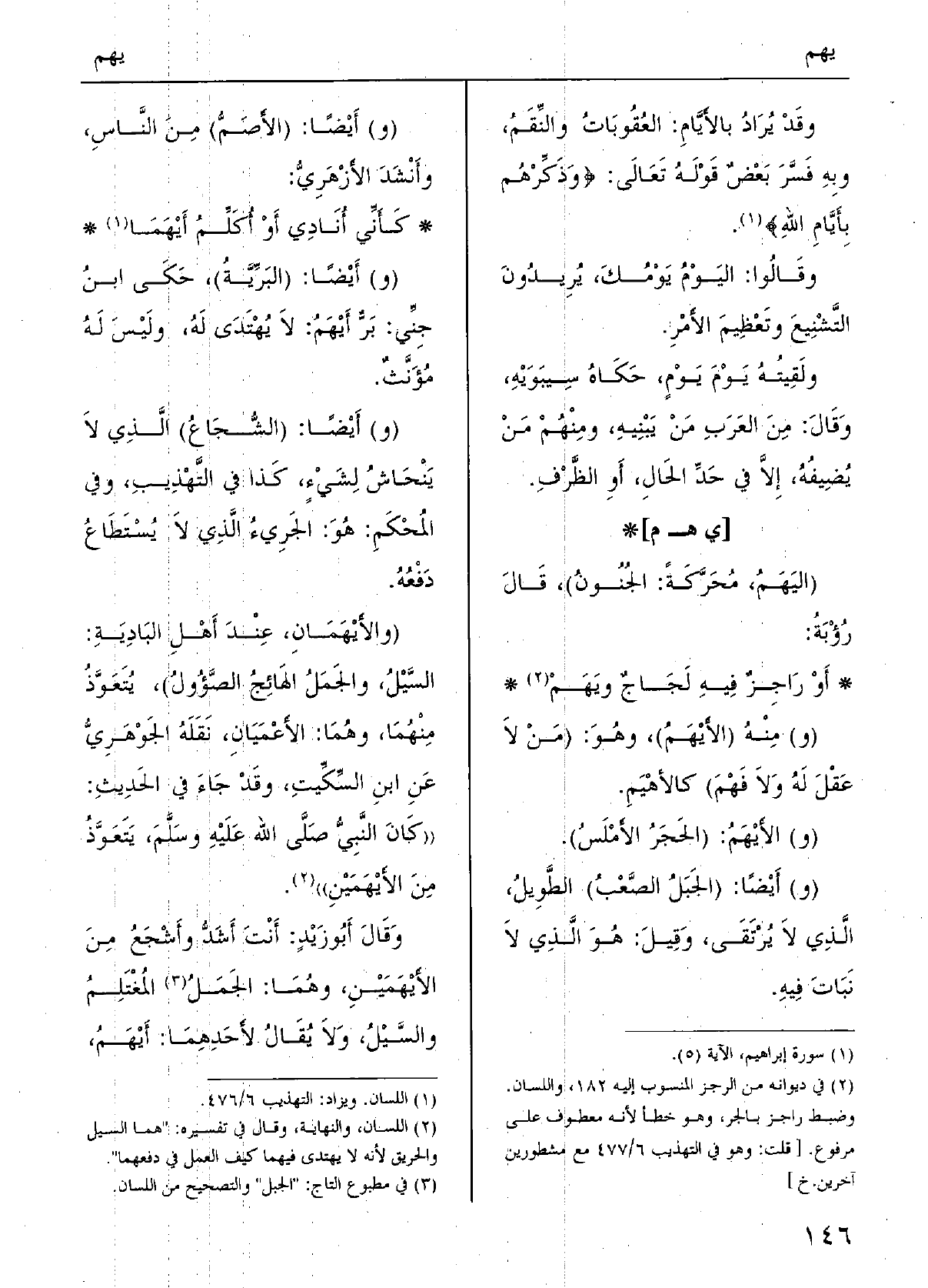 ، يَتَعَوَّذُ مِنَ} الأَيْهَمَيْنِ ". وقالَ أبُو زَيْدٍ: أنتَ أشَدُّ وأَشْجَعُ مِنَ الأَيْهَمَيْنِ، وهُمَا: الجَمَلُ المٌ غْتَلِمُ والسَّيْلُ، وَلَا يُقالُ لأحِدِهِمَا:! أَيْهَمُ،