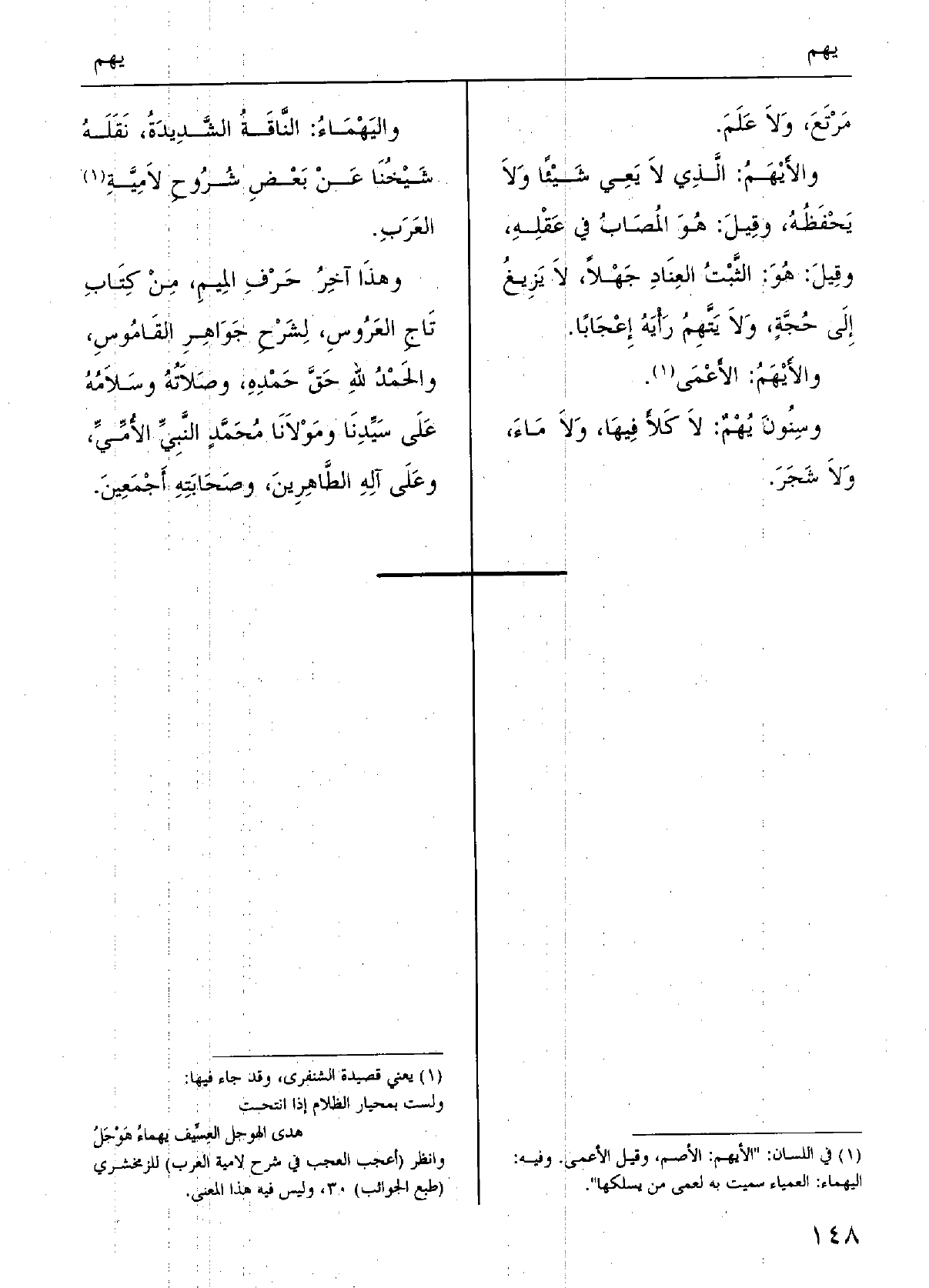 مَرْتَعَ، ولاَ عَلَم. {والأَيْهَمُ: الذِي لاَ يَعِي شَيْئًا ولاَ يَحْفَظُهُ، وَقيل: هُوَ المُصَابُ فِي عَقْلِهِ، وقِيلَ: هُوَ: الثَّبْتُ العِنَادِ جَهْلاً، لَا يَزِيغُ إِلَى حُجَّةٍ، وَلاَ يَتَّهِمُ رَأْيَهُ إْعجَابًا. والأَيْهَمُ: الأْعَمى. وسِنُونَ} يُهْمٌ: لَا كَلأَ فِيهَا، ولاَ مَاءَ، وَلاَ شَجَر. واليَهْمَاءُ: النَّاقَةُ الشَّدِيدَةُ، نَقَلَهُ شَيْخُنَا عَنْ بَعْضِ شُرُوحِ لاَمِيَّةِ العَربَ. وهذَا آخِرُ حَرْفِ المِيمِ، مِنْ كَتَابِ تَاجِ العَرُسِ، لِشَرْحِ جَوَاهِرِ القَمُوسِ، والحمَمْدُ للهِ حَقَّ حَمْدِهِ، وصَلاَتُهُ وسَلاَمُهُ عَلَى سَيِّدِنَا ومَوْلاَنَا مُحَمَّدٍ النَّبيَّ الأُمِّيِّ، وعَلَى آلِهِ الطَّاهِرِينَ، وصَحَابَتِهِ أَجْمَعِنَ.
