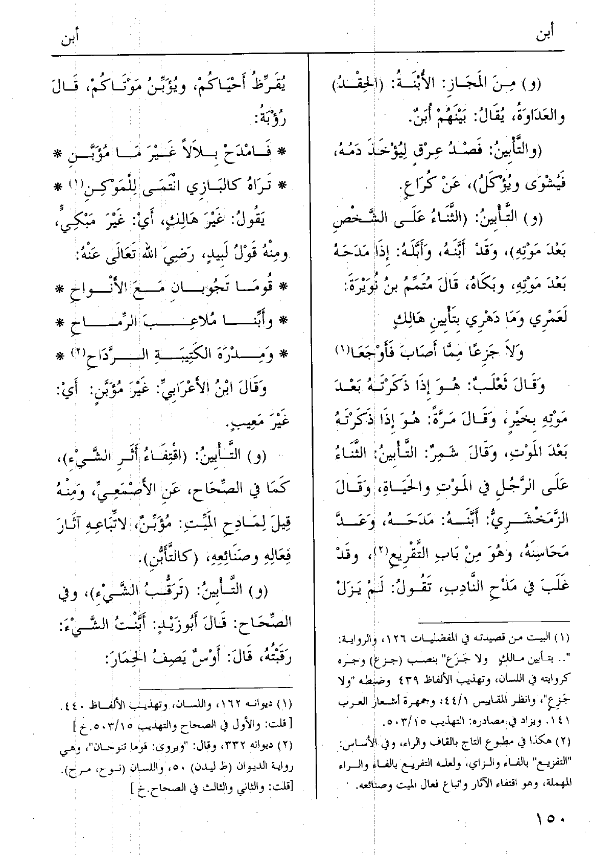 (و) {التَّأْبينُ: (الثَّناءُ على الشَّخْصِ بَعْدَ مَوْتِه) .) وَقد} أَبَّنَه {وأَبَّلَه: إِذا مَدَحَه بعد مَوْتِه وبَكَاهُ؛ قالَ مُتمِّمُ بنُ نُوَيْرة: