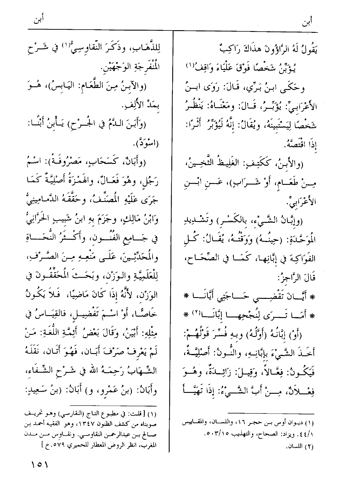 وقالَ بعضُ أَئِمَّة اللُّغَةِ: من لم يَعْرِف صَرْف} أَبان فَهُوَ أَتانٌ، نَقَلَه الشهابُ، رَحِمَه اللَّهُ، فِي شرْحِ الشفاءِ.