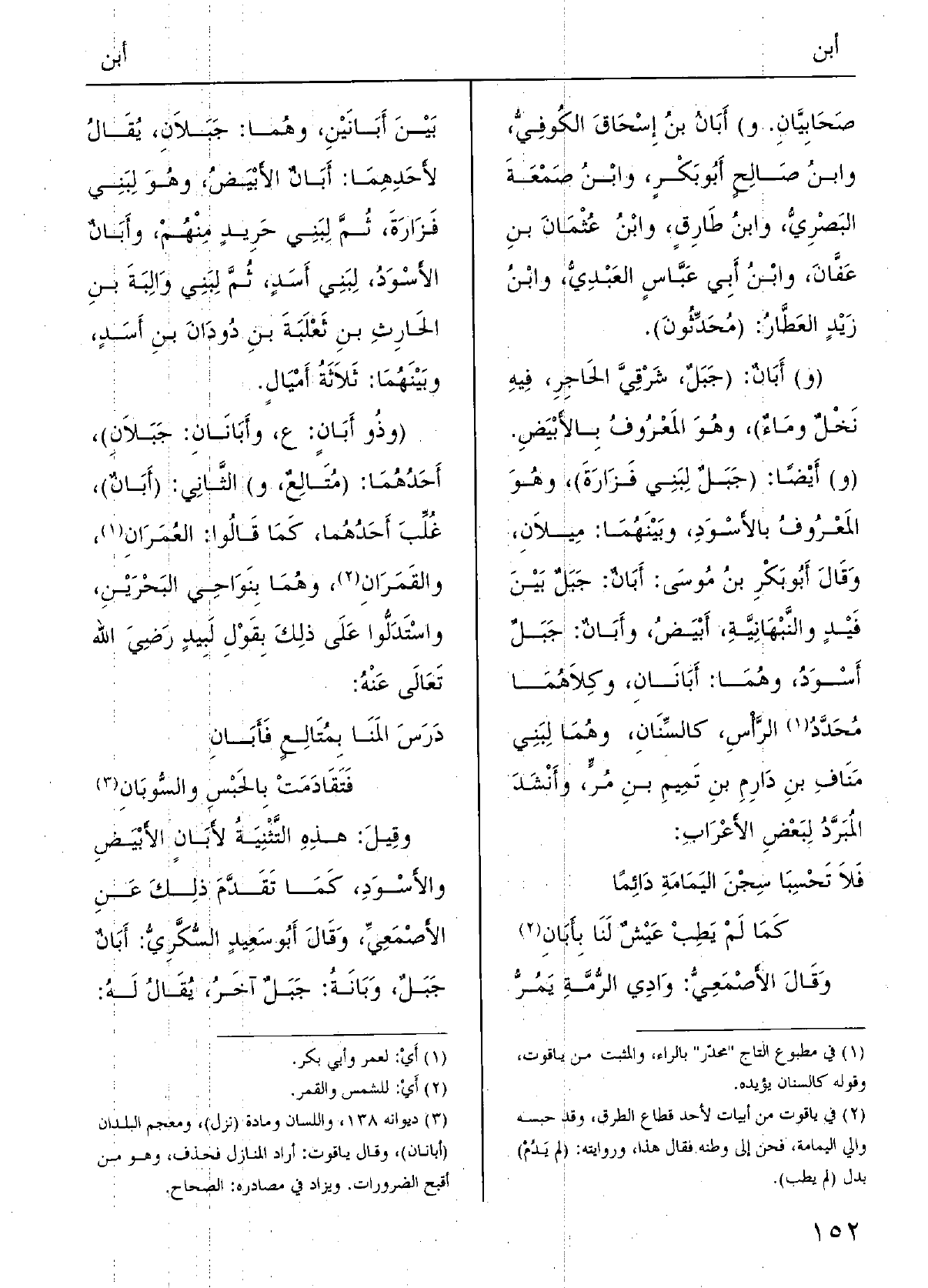 فَلَا تَحْسِبا سِجْن اليَمامَة دائِماً كَمَا لم يطب عَيْشُ لنا {بأَبان وقالَ الأَصْمَعيُّ: وادِي الرُّمةِ يمرُّ بينَ} أَبانَيْنِ، وهُما جَبَلانِ. يقالُ لأَحدِهما أَبانُ الأَبْيَض وَهُوَ لبَني فَزارَةَ ثمَّ لبَني حريد مِنْهُم، وأَبانُ الأَسْوَدُ لبَني أَسَدٍ، ثمَّ لبَني والبَةَ بنِ الحرِثِ بنِ ثَعْلَبَةَ بنُ دُودَان بنِ أَسَدٍ، وبَيْنهما ثلاثَةُ أَمْيالٍ.