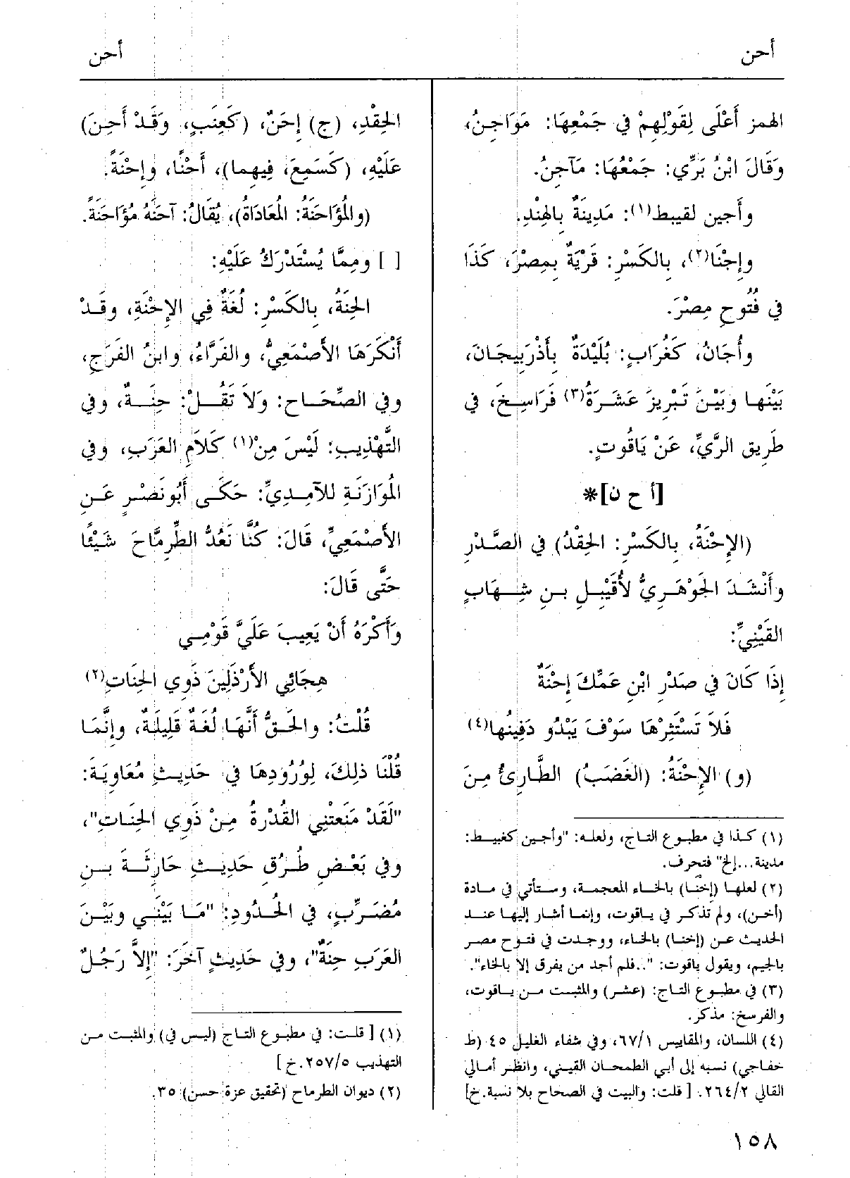إِذا كانَ فِي صَدْرِ ابنِ عمِّكَ {إحْنَةٌ فَلَا تَسْتَثِرْها سوفَ يَبْدُو دَفِينُها (و) الإِحْنَةُ: (الغَضَبُ) الطارِىءُ مِن الحِقْدِ، (ج) } إِحَنٌ (كعِنَبٍ؛ وَقد {أَحِنَ) عليهِ، (كسَمِعَ فيهمَا) } أَحَناً {وإِحْنةً.