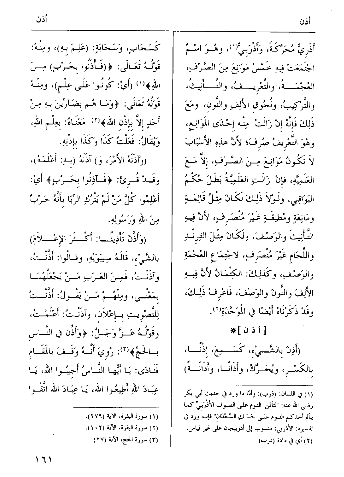 {أَذَرِيٌّ، محرَّكة،} وأَذربيّ، وَهُوَ اسْمٌ اجْتَمَعَتْ فِيهِ خَمْسُ مَوانِع مِن الصَّرْف: العُجْمةُ والتَّعْريفُ والتَّأْنيثُ والتَّرْكيبُ ولحوقُ الأَلِفِ والنُّون، وَمَعَ ذلِكَ فإنَّه إنْ زالَتْ مِنْهُ إحْدَى المَوانِع وَهُوَ التَّعْريفُ صُرِفَ، لأنَّ هَذِه الأَسْبابَ لَا تكونُ مَوانِع مِن الصَّرْف إلاَّ مَعَ العِلْميَّة، فإنْ زالَتِ العِلْميَّة بَطلَ حُكْم البَواقي، وَلَوْلَا ذلِكَ لكانَ مِثْل قائِمَة ومانِعَة ومطيقَة غَيْر مُنْصرف لأنَّ فِيهِ التَّأْنِيث والوَصْف، ولكانَ مِثْل الفِرنِد واللِّجام غَيْر مُنْصرف لاجْتِماع العُجْمةِ والوَصْفِ، وكَذلِكَ الكُتْمان لأنَّ فِيهِ الأَلِفَ والنُّونَ، والوَصْفَ، فاعْرِفْ ذلِكَ، وَقد ذَكَرْناه أَيْضاً فِي الموحَّدَةِ.