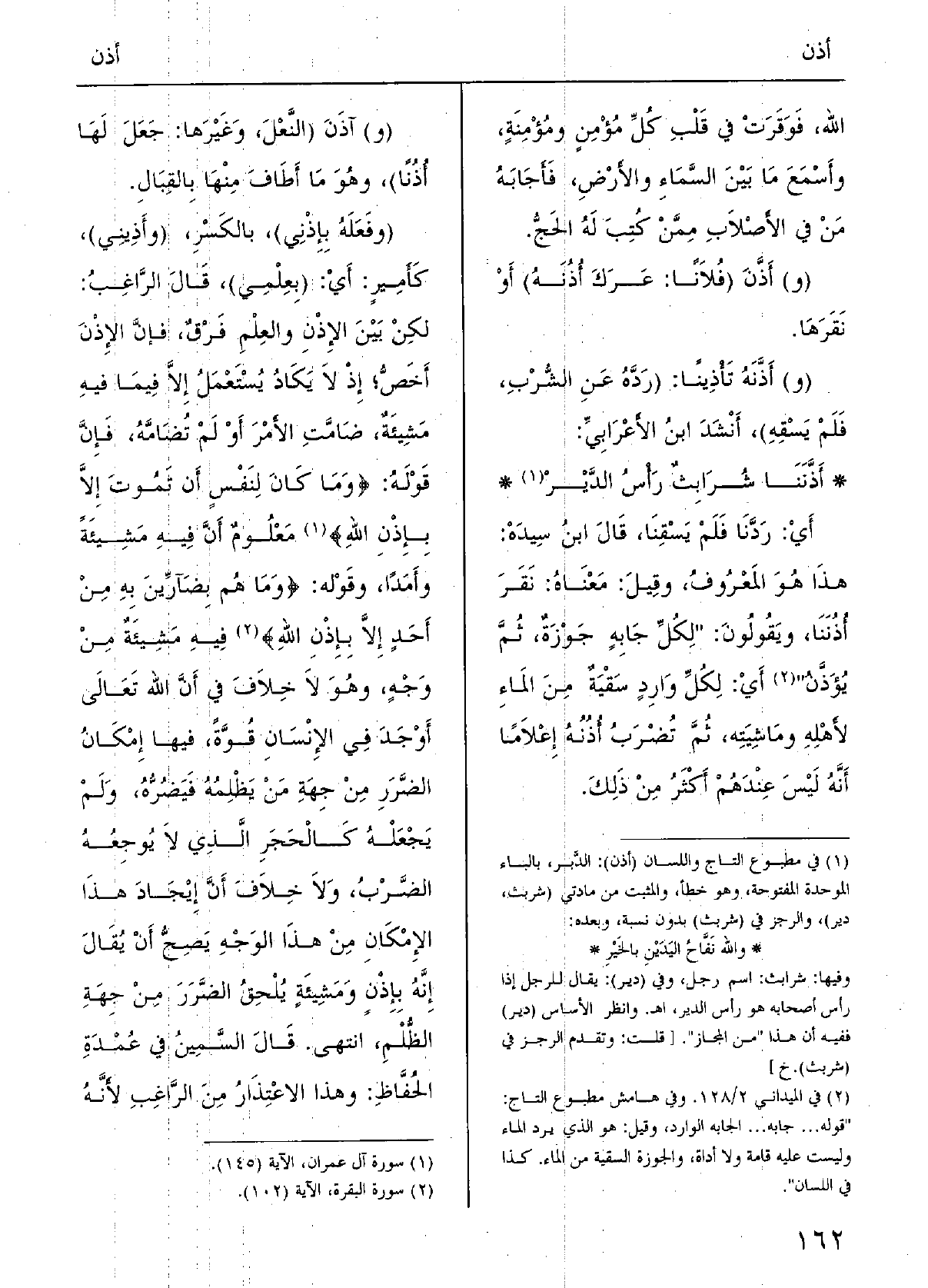 (قالَ الراغبُ: لكنْ بينَ! الإِذْنِ والعِلْمِ فرْقٌ، فإِنَّ الإذْنَ أَخَصُّ إِذْ لَا يكادُ يُسْتَعْملُ إلاَّ فيمَا فِيهِ مَشِيئةٌ، ضامَتِ الأَمْرَ أَو لم تضامه؛ فإنَّ قوْلَه: {وَمَا كانَ لنفْسٍ أَنْ تموتَ إِلاَّ بإِذْنِ اللَّهِ} مَعْلومٌ أنَّ فِيهِ مَشِيئةً وأَمَداً؛ وقوْله: {وَمَا هُمْ بضارِّينَ بِهِ مِن أَحدٍ إِلاَّ بِأذْنِ اللَّهِ} فِيهِ مَشِيئةٌ مِن وَجْهٍ، وَهُوَ لَا خِلافَ فِي أَنَّ اللَّهَ تعالَى أَوْجَدَ فِي الإِنْسانِ قوَّةً فِيهَا إمْكانُ الضَّرَرِ مِن جِهَةِ من يَظْلِمه فيَضرّه وَلم يَجْعَلْه كالحجرِ الَّذِي لَا يوجعه الضَّرْبُ، وَلَا خِلافَ أَنَّ إيجادَ هَذَا الإِمْكان مِن هَذَا الوَجْه يَصحّ أَنْ يقالَ إنَّه بإِذْن ومَشِيئة يَلْحق الضَّرَر مِن جهَةِ الظُّلْم، انتَهَى.