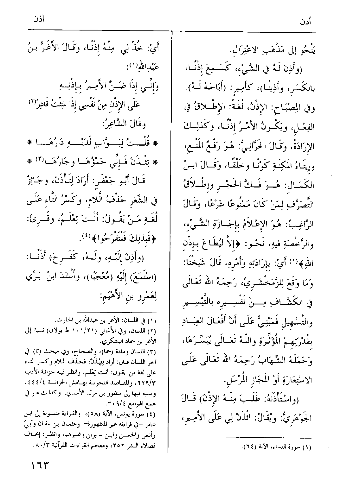 وقالَ الرَّاغبُ: هُوَ الإِعْلامُ بإِجازَةِ الشيءِ والرّخْصَة فِيهِ، نحْو: {إلاّ ليُطَاعَ بإِذْنِ اللَّهِ} أَي بإرَادَتِه وأَمْرِه.