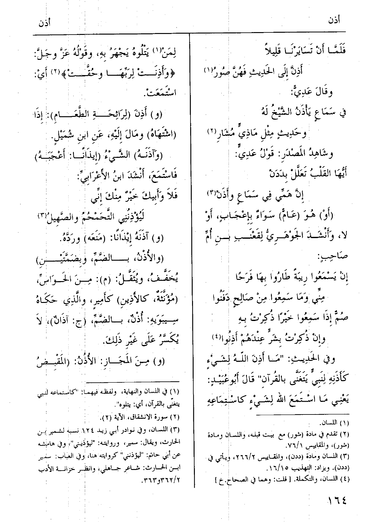 إِن يَسْمَعُوا رِيبةً طارُوا بهَا فَرَحاً مِنِّي وَمَا سَمِعوا من صالِحٍ دَفَنُواصُمٌّ إِذا سَمِعوا خَيْراً ذُكِرْتُ بهوإِن ذُكِرْتُ بشَرَ عنْدَهم} أَذِنوا وَفِي الحَدِيْثِ: (مَا {أَذِنَ اللَّهُ لشيءٍ كأَذَنِه لِنَبيَ يَتَغَنَّى بالقُرْآنِ) .