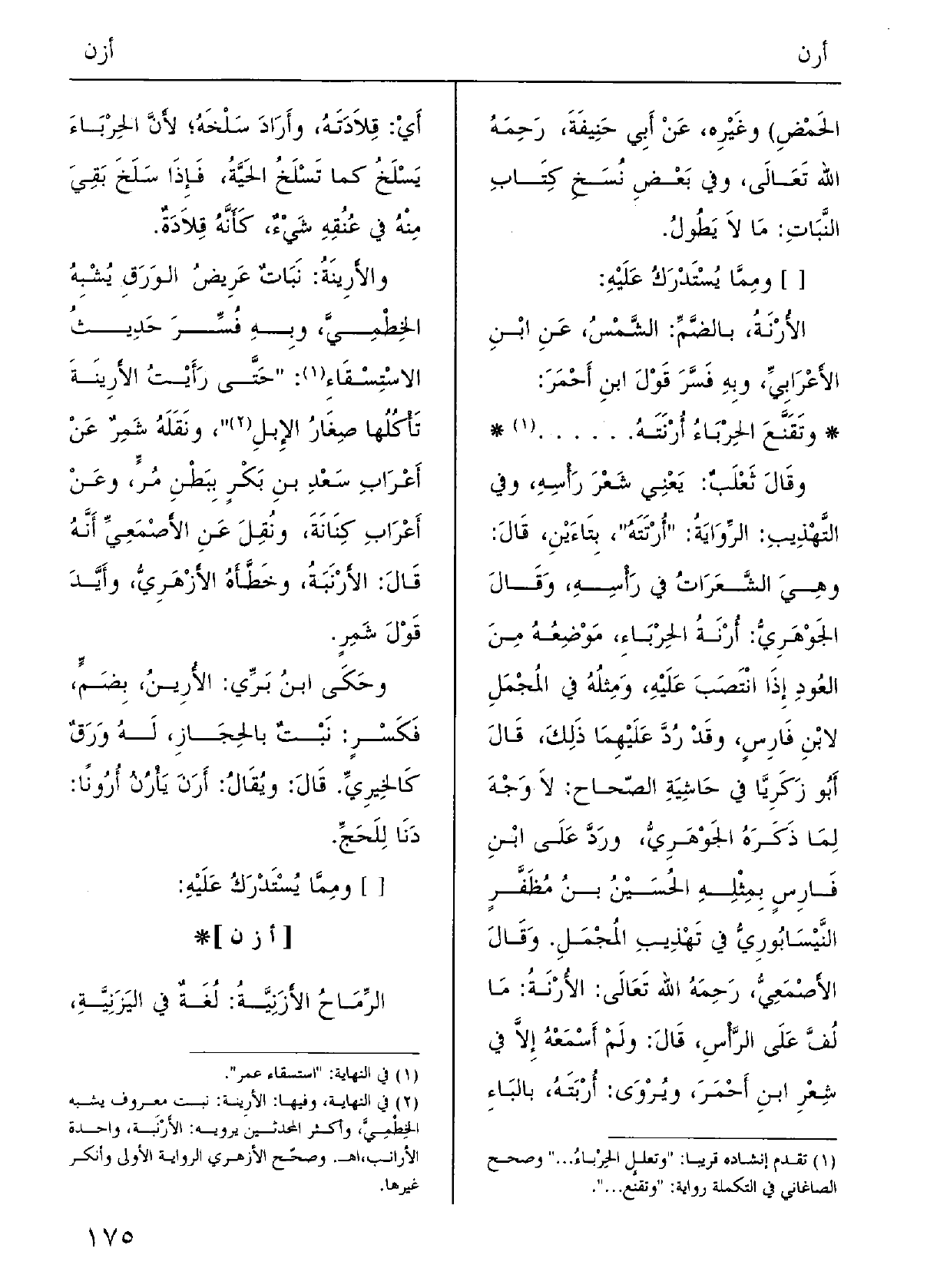 ونَقَلَه شَمِرٌ عَن أَعْرابِ سعْدِ بنِ بكْرٍ ببطنِ مُرَ، وَعَن أَعْرابِ كِنانَة ونُقِل عَن الأَصْمعيّ أنَّه قالَ: الأَرِنية.