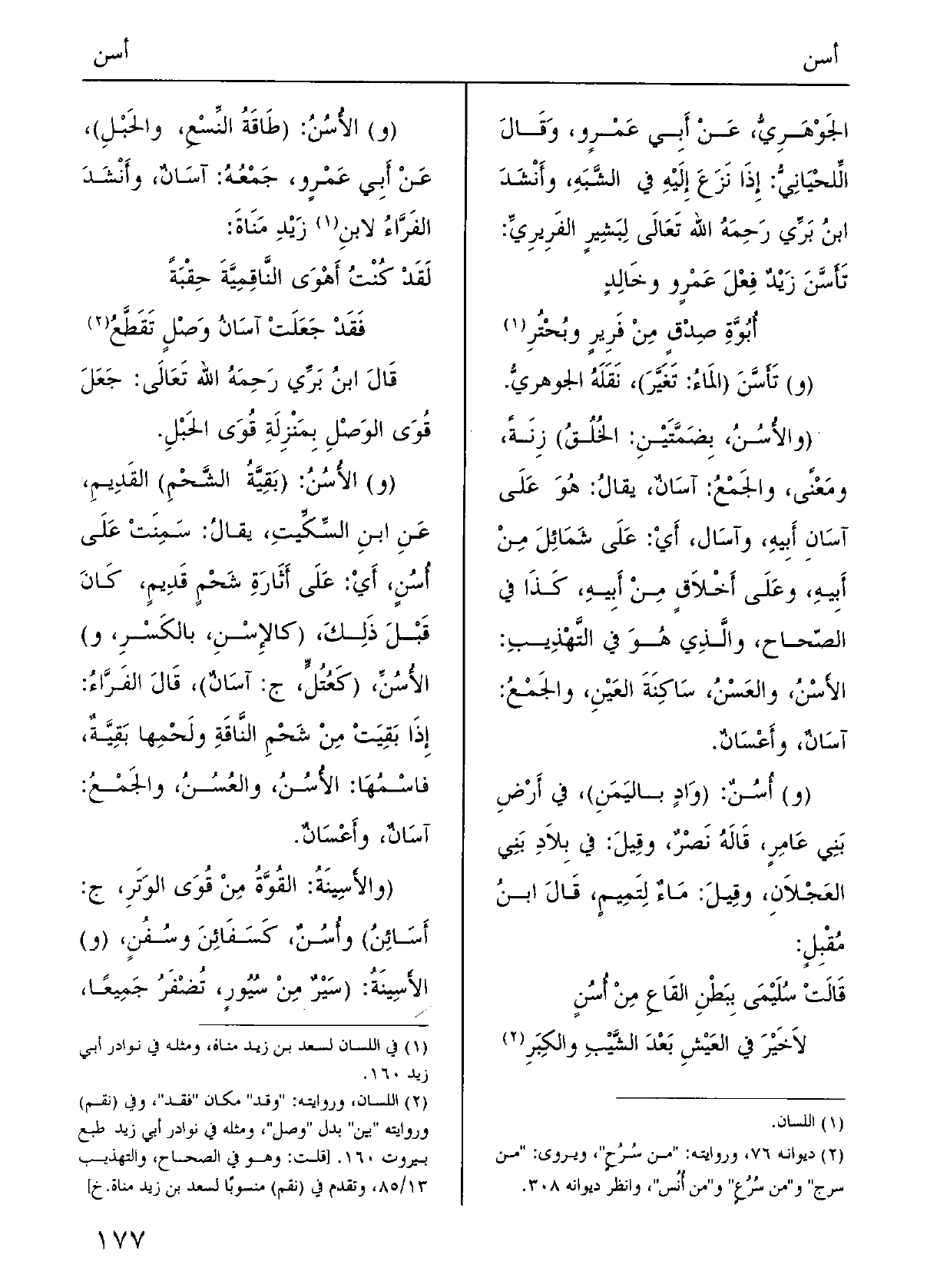 قَالَت سُلَيْمَى ببَطْنِ القاعِ من أُسُنٍ لَا خَيْرَ فِي العَيْشِ بعدَ الشَّيْبِ والكِبَرِ (و) {الأُسُنُ: (طاقَةُ النِّسْعِ والحَبْلِ) ؛) عَن أَبي عَمْرو، وجَمْعُه آسانٌ، وأَنْشَدَ الفرَّاءُ لابنِ زيْدِ مَنَاة: