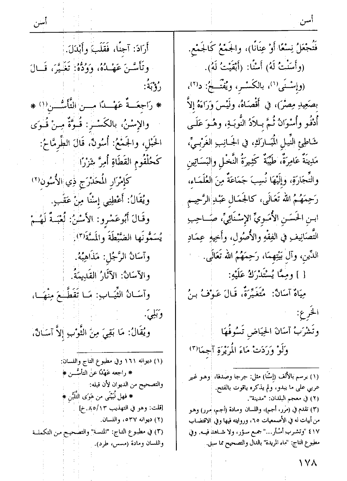 راجَعَه عَهداً من} التأَسُّن {والإِسْنُ، بِالْكَسْرِ: قُوَّةٌ مِن قُوَى الحَبْلِ، والجمْعُ} أُسُونٌ؛ قالَ الطرمَّاحُ: