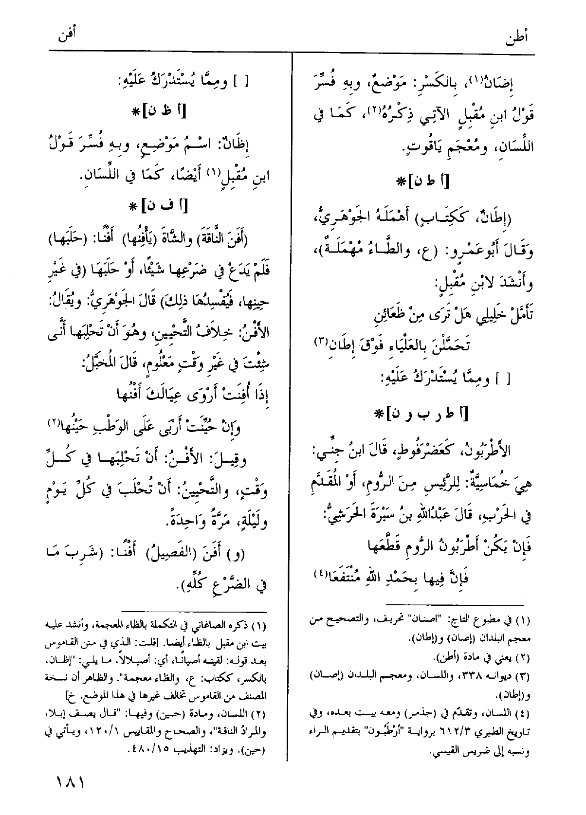 (قالَ الجَوْهرِيُّ: ويقالُ: {الأَفْنُ خِلافُ التَّحْيينِ، وَهُوَ أَنْ تحْلُبَها أَنَّى شِئْتَ فِي غيرِ وقْتٍ مَعْلومٍ؛ قالَ المُخبَّل: