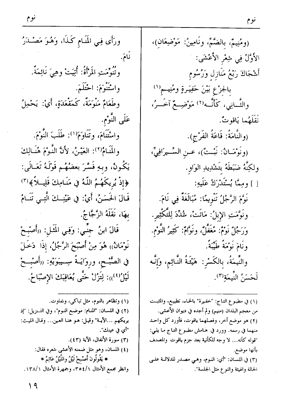والثَّانِي، كَأَنَّه مَوْضِعٌ آخَرُ، نَقَلَهُما يَاقوتٌ. ( {والنَّامَةُ: قَاعَةُ الفَرْجِ) . (} ونَوْمَانُ: نَبْتٌ) ، عنِ السِّيرَافِيِّ، ولكِنَّهُ ضَبَطَهُ بِتَشْدِيدِ الوَاوِ. [] ومِمَّا يُسْتَدْرَكُ عَلَيهِ: {نَوَّمَ الرَّجُلُ} تَنْوِيماً: مُبَاَلَغَةٌ فِي نَامَ. {ونَوَّمَتِ الإِبِلُ: مَاتَتْ، شُدِّدَ لِلتَّكْثِيرِ. وَرَجُلٌ} نَوْمٌ: مَغَفَّلٌ، {ونَوَّامٌ: كَثِيرُ النُّوْمِ.} ونَامَ {نَوْمَةً طَيِّبَةً.} والنِّيمَةُ، بِالكَسْرِ: هَيْئَةُ {النَّائِمِ، وَإِنَّه لَحَسَنُ} النَّيمَةِ. ورَأَى فِي المَنَام كَذَا، وَهُوَ مَصْدَرُ نَامَ. {وتُنُوِّمَتِ المَرْأَةُ: أُتِيَتْ وهِيَ} نَائِمَةٌ. {واسْتَنْوَمَ: احْتَلَمَ. وطَعَامٌ} مَنْوَمَةٌ، كَمَقْعَدَةٍ، أَيْ: يَحْمِلُ عَلَى النَّوْمِ. {واسْتَنَامَ،} وتَنَاوَمَ: طَلَبَ النَّوْمَ. {والمَنَامُ: العَيْنُ، لأَنَّ النَّوْمَ هُنَالِكَ يَكُونُ، وبِهِ فَسَّر بعضُهُم قَوْلَهُ تَعَالَى: {إِذْ يريكهم الله فِي} مَنَامك قَلِيلا} قَالَ الحَسَنُ، أَيْ: فِي عَيْنِكَ الَّتِي تَنَامُ بِهَا، نَقَلَهُ الزَّجَّاجُ. قَالَ ابنُ جِنَّي: وَفي المَثَلِ: ((أَصبْحْ! نَوْمَانُ)) هُوَ مِنْ أَصْبَحَ الرَّجُلُ، إِذَا دَخَلَ فِي الصُّبْحِ، ورِوَايَةُ سِيبَوَيْهِ: ((أَصِبْحْ لَيْلُ)) : لِتَزْلُ حَتَّى يُعَاقِبَكَ الإِصْبَاحُ.