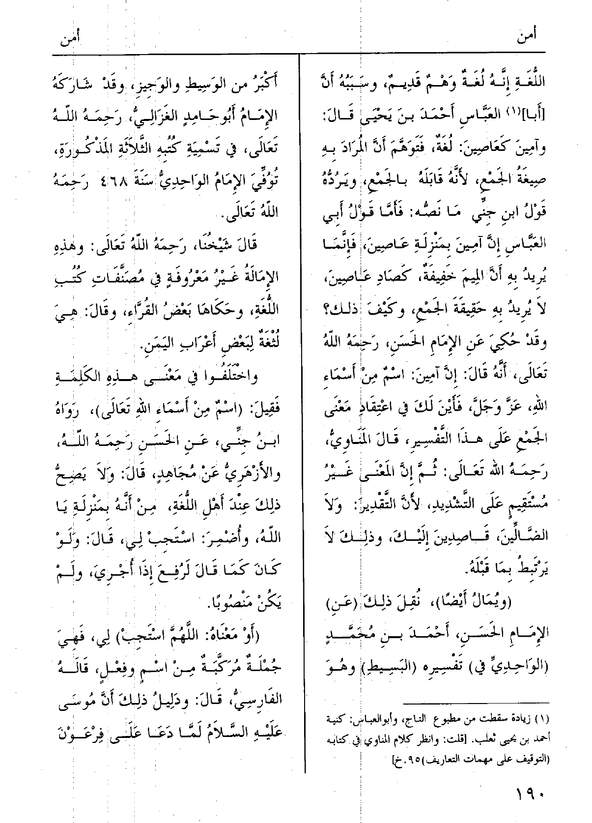 اللُّغَةِ إنَّه لُغَةٌ وهمٌ قدِيمٌ وسبَبُه أنَّ (أَبَا) العبَّاسِ أحْمد بن يَحْيَى قالَ:! وآمِينَ كعاصِينَ لُغَةٌ فتَوَهم أنَّ المُرادَ بِهِ صِيغَة الجَمْع لأنَّه قابلَه بالجَمْعِ ويردُّه قَوْل ابْن جنِّي مَا نَصَّه: فأَمَّا قَوْل أَبي العبَّاس أنَّ آمِينَ بمنْزلَةِ عاصِينَ فَإِنَّمَا يُريدُ بِهِ أنَّ الميمَ خَفيفَةٌ كصادِ عاصِينَ، لَا يُريدُ بِهِ حَقيقَةَ الجَمْعِ، وكيفَ ذلكَ وَقد حُكي عَن الإمامِ الحَسَنِ، رحِمَه اللَّهُ تَعَالَى، أَنَّه قالَ: إنَّ آمِينَ اسمٌ مِن أَسْماءِ اللَّهِ، عزَّ وجلَّ، فأَيْنَ لكَ فِي اعْتِقادِ معْنَى الجَمْع على هَذَا التَّفْسِير؟