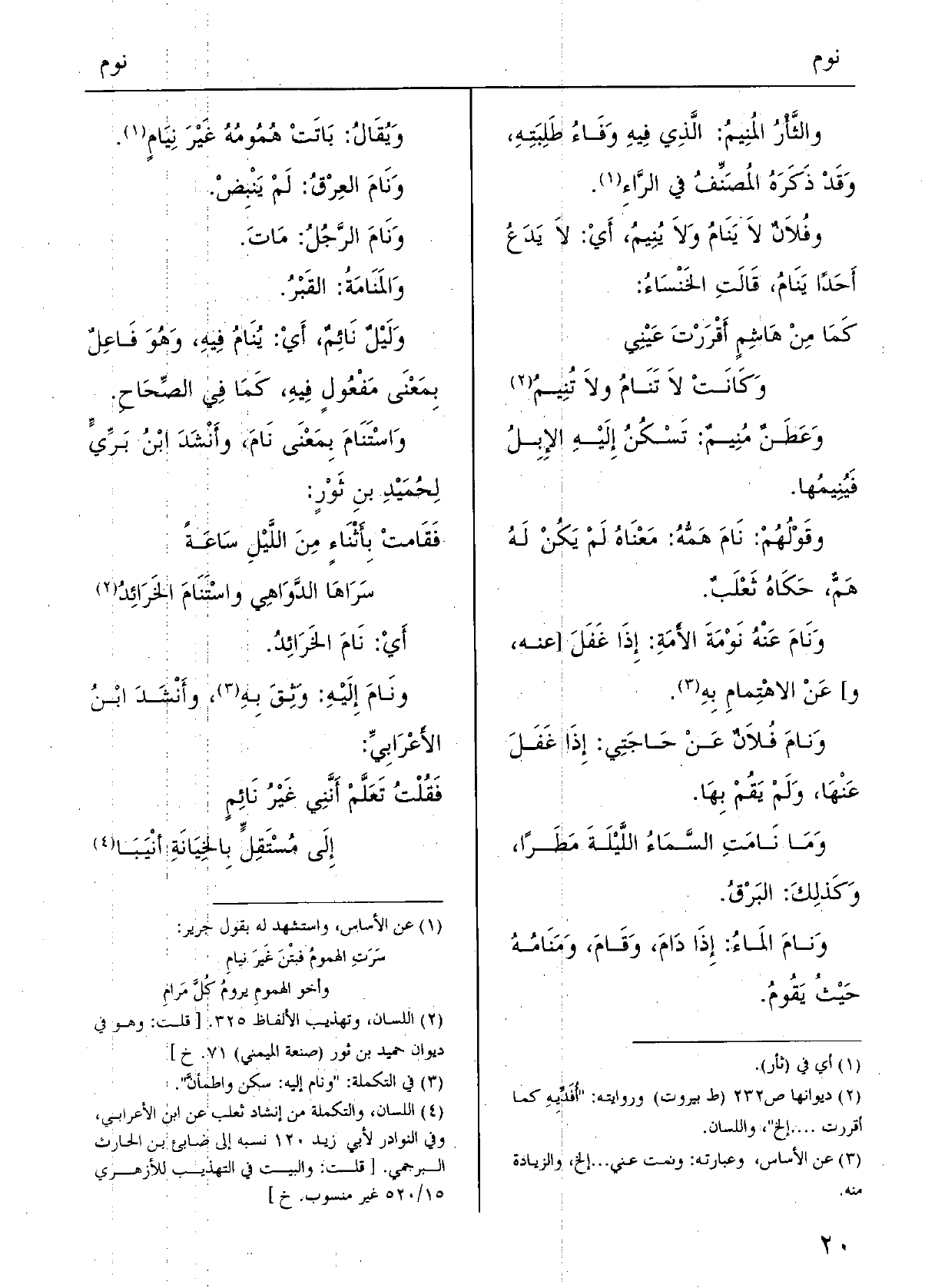وعَطَنٌ {مُنيمٌ: تسكُنُ إِلَيْهِ الإبِلُ فيُنيمُها. وقولُهُمْ: نامَ هَمُّهُ: معناهُ لم يَكنْ لَهُ هَمٌّ، حَكَاهُ ثَعْلَبٌ. ونام عَنْهُ} نَوْمَةَ الأمَةِ: إِذا غَفَلَ [عَنهُ، و] عَن الاهتِمام بِهِ. ونامَ فُلانٌ عَن حَاجَتي: إِذا غَفَلَ عَنْهَا، وَلم يَقُمْ بهَا. وَمَا {نامَتِ السَّماءُ اللَّيلةَ مَطرًا، وكذلكَ: البَرْقُ. ونام الماءُ: إِذا دامَ، وقامَ،} ومَنامُهُ حيثُ يَقومُ. وَيُقَال: باتَتْ هُمومُهُ غيرَ {نِيامٍ. ونام العِرْقُ: لم يَنْبِضْ. ونام الرَّجُلُ: ماتَ.} والمنامةُ: القَبْرُ. ولَيلٌ نائِمٌ، أَي: {يُنامُ فِيهِ، وَهُوَ فاعِلٌ بِمَعْنى مفعولٍ فِيهِ، كَمَا فِي الصِّحاح.} واسْتَنامَ بِمَعْنى نامَ، وأنشَدَ ابْن بَرِّيٍّ لحُمَيْد بن ثَوْرٍ: