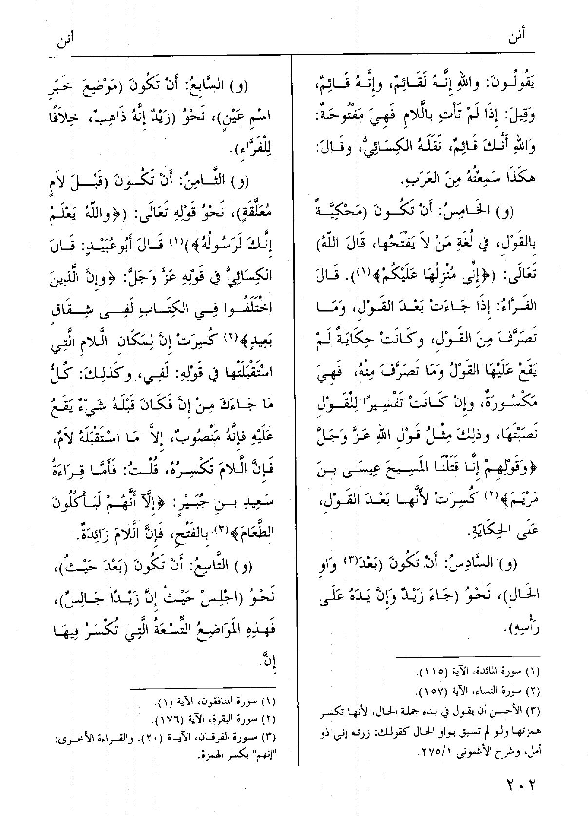 (و) الخامِسُ: أَنْ تكونَ (مَحْكِيَّةً بالقَوْلِ فِي لُغَةِ من لَا يَفْتَحُها قالَ اللَّهُ تَعَالَى: {} إِنِّي مُنْزِلُها عَلَيْكُمْ} ) ، قالَ الفرَّاءُ: إِذا جاءَتْ بَعْدَ القَوْلِ وَمَا تصرَّف مِنَ القَوْل وكانتْ حكايَةً لم يَقَعْ عَلَيْهَا القوْلُ وَمَا تصرَّف مِنْهُ فَهِيَ مكْسُورَةٌ، وَإِن كانتْ تفْسِيراً للقوْلِ نَصَبَتْها وذلِكَ مثْل قَوْل اللَّهِ، عزَّ وجلَّ: {وقوْلِهم {إنَّا قَتَلْنا المَسِيحَ عيسَى ابْن مَريَمَ} ، كسَرْتَ لأنَّها بعْدَ القَوْلِ على الحِكايَةِ.