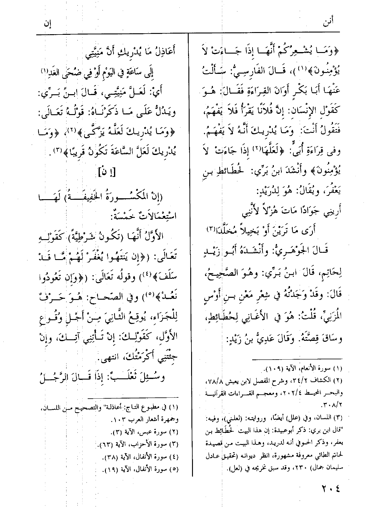 : ( {إنْ: المكْسورَةُ الخَفيفَةُ) لَهَا اسْتِعمالاتٌ خَمْسةٌ: