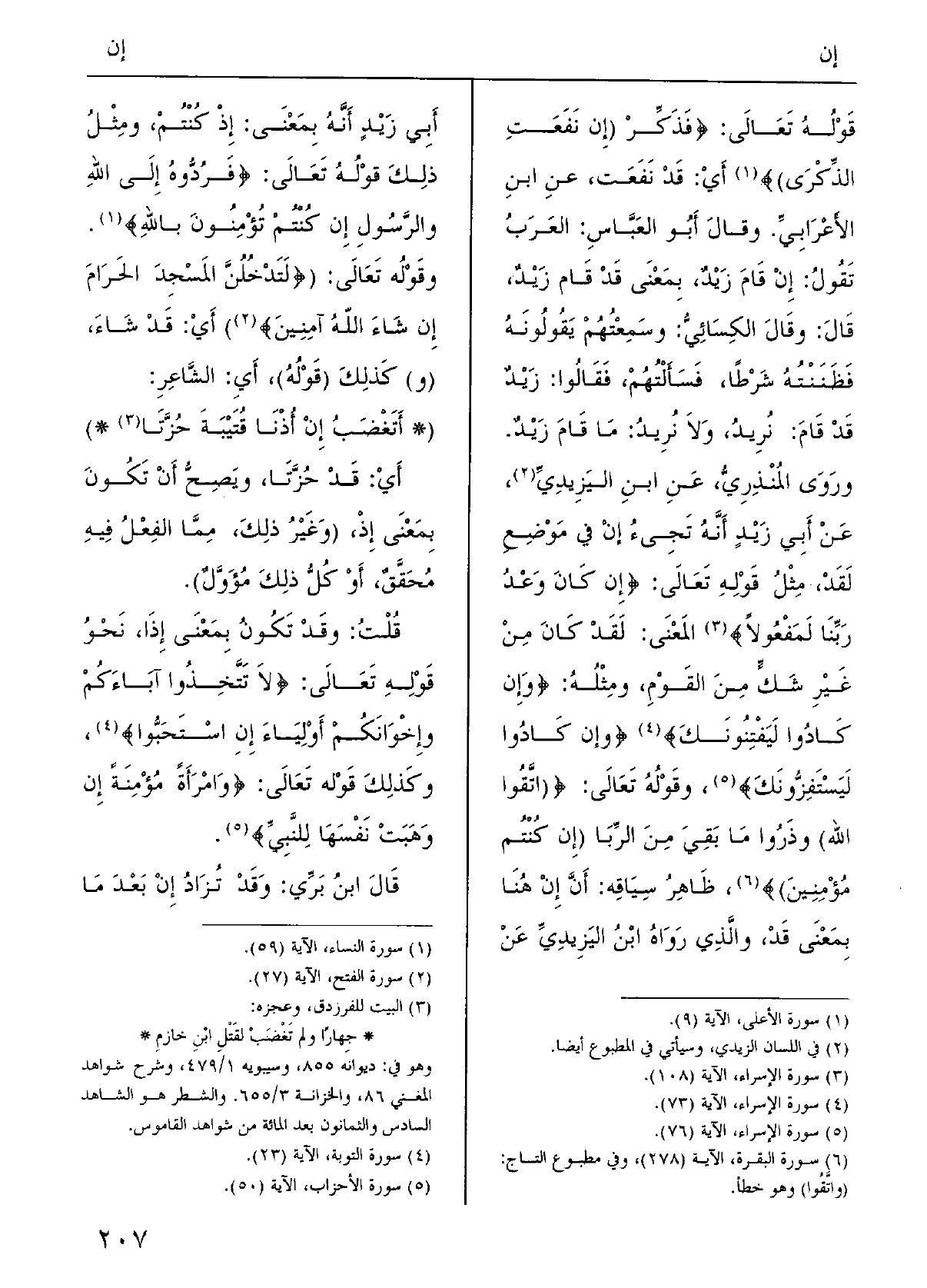 ورَوَى المُنْذريُّ عَن ابنِ اليَزِيدي عَن أَبي زيْدٍ أَنَّه تَجِيءُ إنْ فِي موْضِعِ لقَدْ، مثْل قَوْله تَعَالَى: {إنْ كانَ وَعْدُ رَبِّنا لمفْعولاً} ،) المعْنَى لقَدْ كانَ مِن غيرِ شكَ مِنَ القوْمِ، ومثْلُه: {وإنْ كادُوا لَيَفْتِنونَك} ، {وَإِن كادُوا ليَسْتَفِزُّونَك} ؛ وقَوْله تَعَالَى: { (واتَّقوا اللَّهَ) وذَروا مَا بقيَ مِنَ الرِّبا (إِن كُنْتُمْ مُؤْمِنِينَ) } ) ظاهِرُ سِياقِه أنَّ إنْ هُنَا بمعْنَى قَدْ، وَالَّذِي رَوَاه ابنُ اليزيدي عَن أَبي زيْدٍ أنَّه بمعْنَى إِذْ كُنْتُم، ومِثْلُ قَوْلُه تعالَى: {فردُّوه إِلَى اللَّهِ والرَّسولِ إنْ كُنْتُم تُؤْمِنُون باللَّهِ} ،) وقَوْله تَعَالَى: { (لَتَدْخُلُنَّ المَسْجِدَ الحَرامَ إنْ شاءَ اللَّهُ آمِنينَ) } ،) أَي قَدْ شاءَ؛ (و) كذلِكَ (قَوْلُه) ، أَي الشَّاعِر: