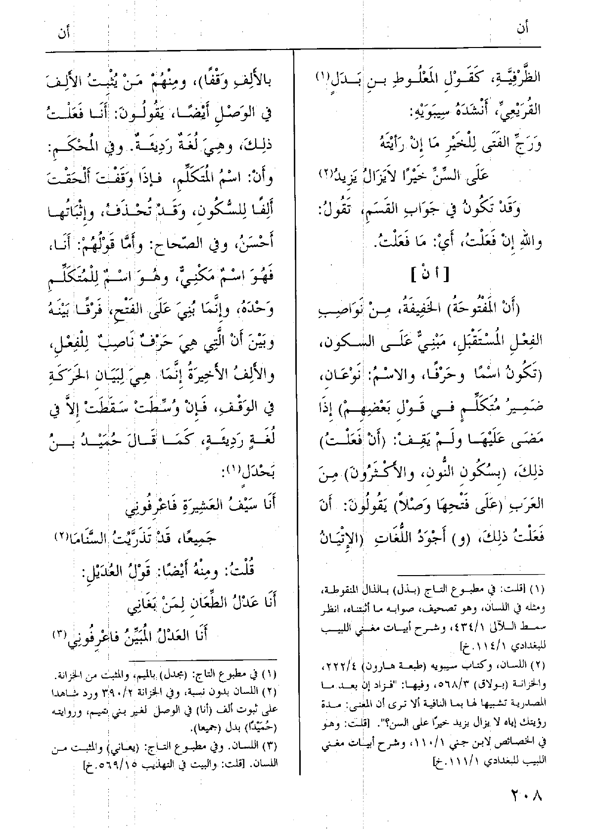 : ( {أَنْ، المَفْتُوحَةُ) الخَفْيفَةُ مِن نواصِبِ الفِعْلِ المستقبلِ مَبْني على السكونِ (تكونُ اسْماً وحَرْفاً، والاسمُ نَوْعانِ: ضَميرُ مُتَكَلِّمٍ فِي قَوْلِ بَعْضِهم) إِذا مَضَى عَلَيْهَا وَلم يقفْ (أَنْ فَعَلْتُ) ذلكَ (بسكونِ النُّونِ والأكْثَرونَ) مِن العَرَبِ (على فَتْحِها وَصْلاً) يقُولُون:} أَنَ فَعَلْتُ ذلكَ، (و) أَجْودُ اللّغاتِ، (الإِتْيان بالألِفِ وَقْفاً) ، وَمِنْهُم مَن يُثْبِتُ الأَلفَ فِي الوَصْلِ أَيْضاً يقُولُ:! أَنَا فَعَلْتُ ذلكَ، وَهِي لُغَةٌ رَدِيئَةٌ.