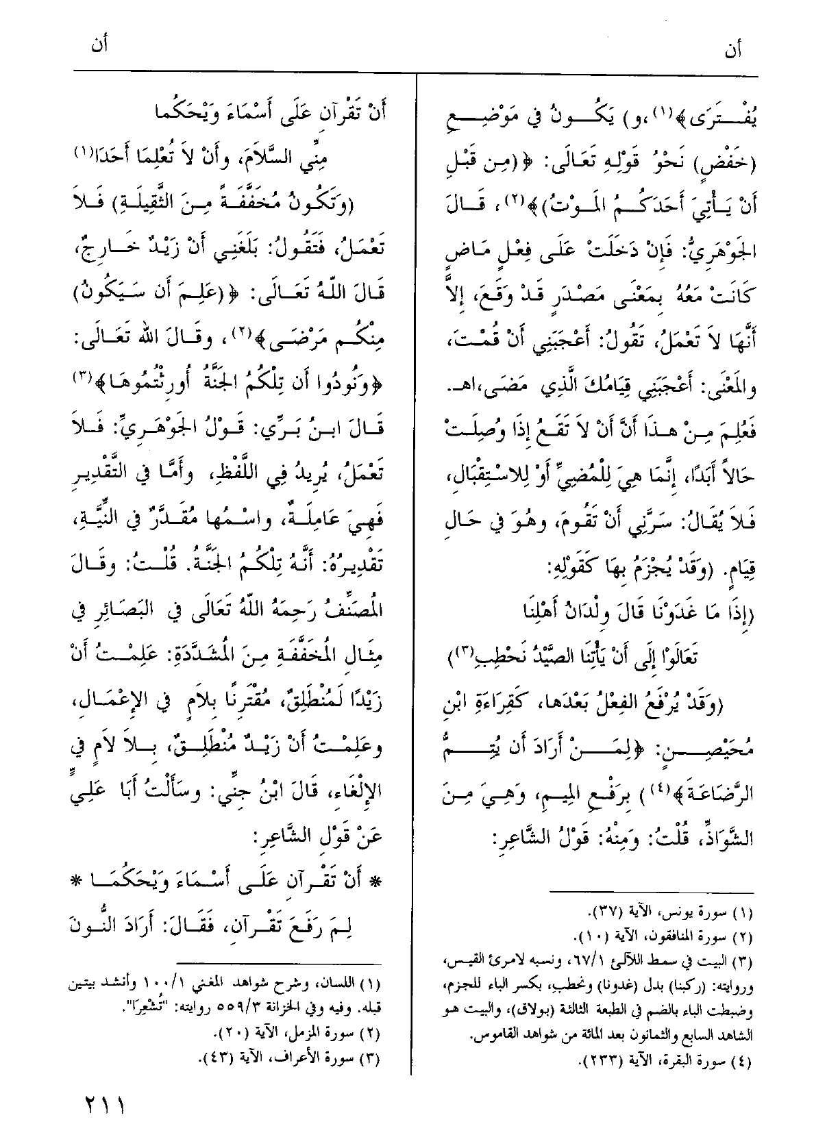 أَنْ تَقْرآنِ على أَسماءَ وَيحَكُمامِنِّي السلامَ وأَنْ لَا تُعْلِما أَحَدا (وتكونُ مُخَفَّفَةً من الثَّقيلةِ) فَلَا تَعْمَلُ، فتقُولُ: بَلَغَني أَنْ زيدٌ خارجٌ؛ قالَ اللَّهُ تعالَى: { (عَلِمَ أَنْ سَيكونُ) مِنْكم مَرْضَى} ؛ وقالَ اللَّهُ تَعَالَى: {ونُودُوا أَنْ تِلْكُمُوا الجنَّةُ أُورِثْتُموها} .