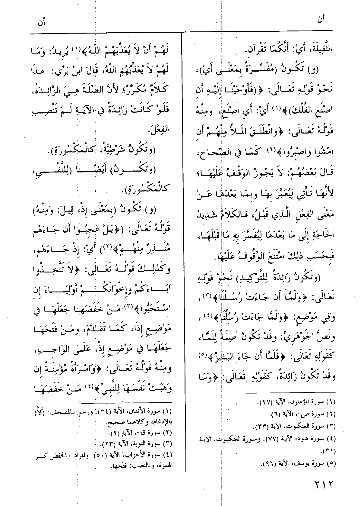 (و) تكونُ (مُفْسِرةً بمعْنَى أَي) نَحْو قَوْله تَعَالَى: { (فأَوْحَيْنا إِلَيْهِ أَنِ اصْنَعِ الفُلْكَ) } ،) أَي أَي اصْنَع؛ وَمِنْه قَوْلُه تَعَالَى: {وانْطَلَقَ المَلأُ مِنْهُم أَنِ امْشوا واصْبِرُوا} ؛ كَمَا فِي الصِّحاحِ.