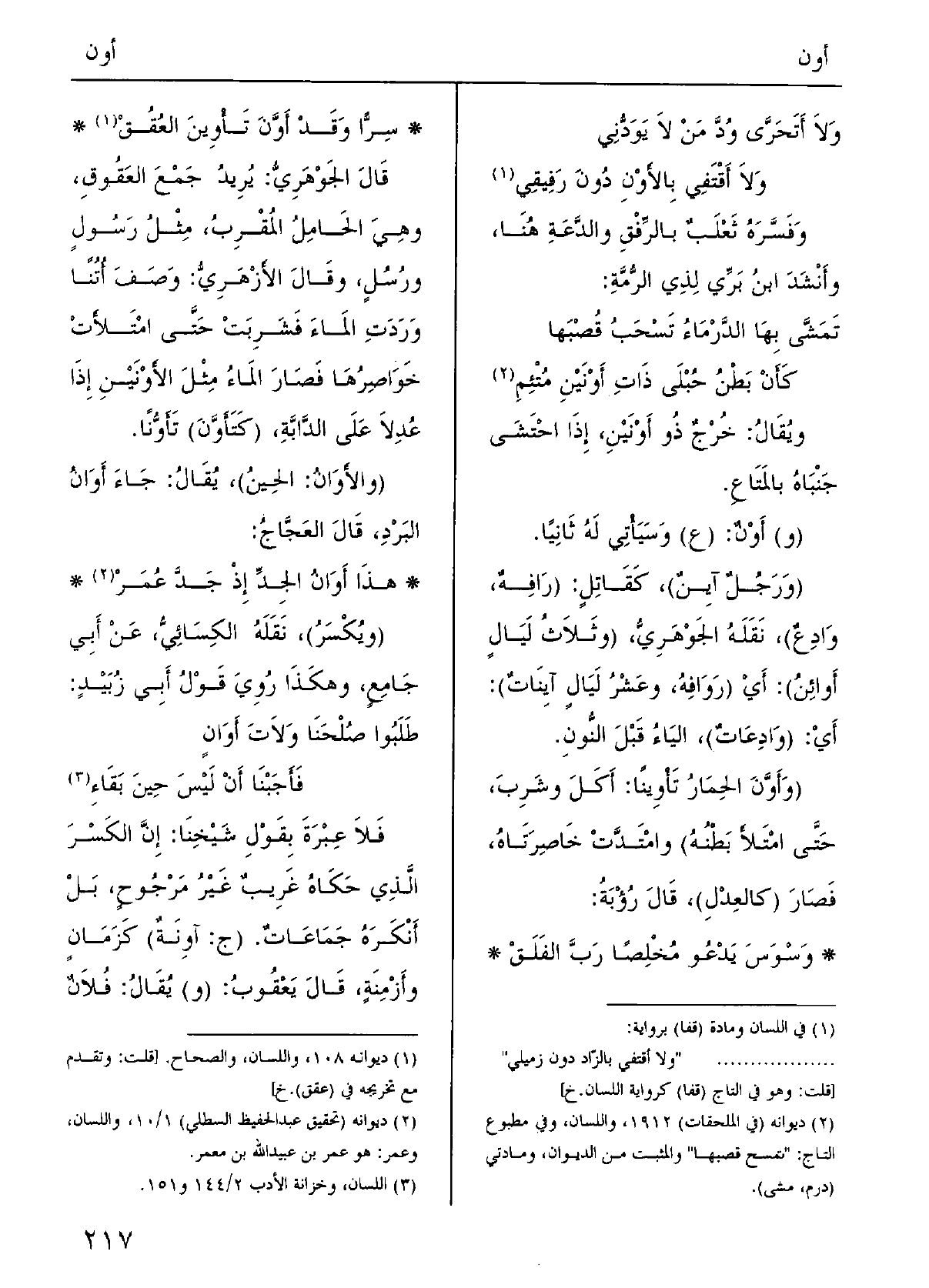 وَلَا أَتَحَرَّى وُدَّ مَنْ لَا يَوَدُّني وَلَا أَقْتَفي {بالأَوْنِ دُونَ رَفِيقي وفسَّرَه ثَعْلَب بالرِّفْقِ والدَّعَةِ هُنَا؛ وأَنْشَدَ ابنُ بَرِّي لذِي الرُّمّة: