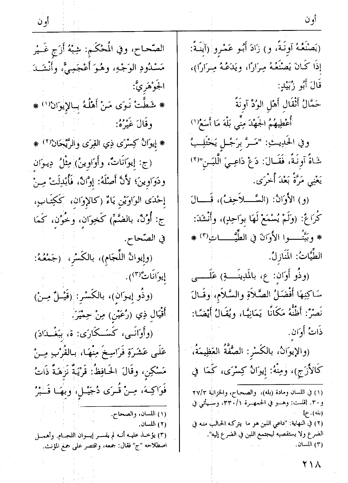 إيوانُ كِسْرى ذِي القِرى والرَّيحان (ج {إيواناتٌ} وأَوَاوِينُ) ، مثْلُ دِيوانٍ ودَواوِين، لأنَّ أَصْلَه إِوَّانٌ فأُبْدِلَتْ مِن إحْدى الوَاوَيْن يَاء؛ ( {كالإِوانِ، ككِتابٍ، ج} أُونٌ، بالضَّمِّ) ، كخِوانٍ وخُونٍ، كَمَا فِي الصِّحاحِ.