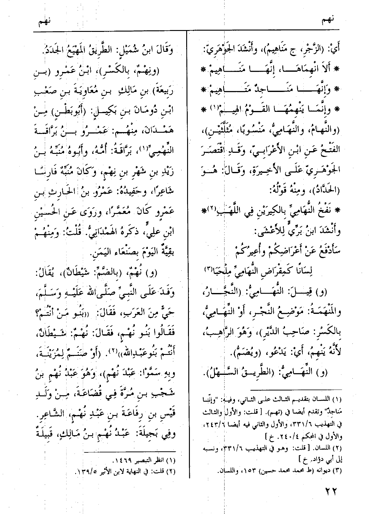 (و) قيل: النُّهامِيُّ: (النَّجَّارُ، والمَنْهَمَةُ: مَوضِع النَّجْرِ، أَو النِّهامِيُّ، بِالْكَسْرِ: صَاحب الدَّيْرِ) ، وَهُوَ الرَّاهِبُ، لِأَنَّهُ يَنْهِمُ، أَي: يَدْعُو، (ويُضَمُّ) . (و) النِّهامِيُّ: (الطَّرِيق السَّهْل) . وَقَالَ ابْن شُميل: الطَّريقُ المَهْيَعُ الجَدَدُ. (ونِهْمٌ، بِالْكَسْرِ) ، ابْن عَمْرو (بن ربيعةَ) بن مَالك بن مُعَاوِيَة بن صَعْبِ ابْن دومانَ بن بَكيلٍ: (أَبُو بَطْنٍ) مِنْ هَمْدانَ، مِنْهُم: عَمْرو بن بَرَّاقَةَ النِّهْمِيِّ، بَرَّاقَةُ: أمه، وَأَبوهُ مُنَبِّه بن زيد بن شهر بن نِهْمٍ، وَكَانَ مُنَبِّهٌ فَارِسًا شَاعِرًا، وحفيده: عَمْرو بن الْحَارِث بن عَمْرو كَانَ مُعَمَّرًا، وروى عَن الحُسين ابْن عَليّ، ذكره الهمْدانِيُّ. قلت: وَمِنْهُم بقِيَّةٌ الْيَوْم بِصَنْعَاء الْيمن. (و) نُهْمٌ (بِالضَّمِّ: شَيْطانٌ) ، يُقَال: وَفَدَ على النَّبِي
