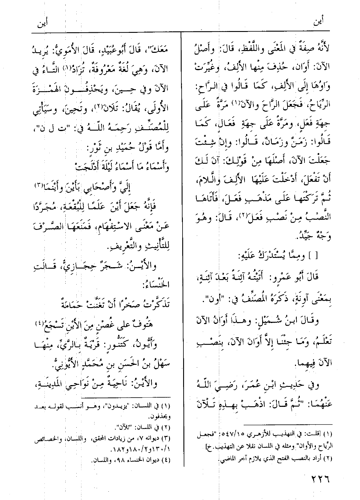 قالَ أَبو عُبَيْدٍ: قالَ الأُمويُّ: يريدُ الآنَ وَهِي لُغَةٌ مَعْروفةٌ تُزادُ التاءُ فِي الآنَ وَفِي حِينٍ ويحذِفُونَ الهَمْزَةَ الأُولى، يقالُ: {تَلانَ وتَحينَ، وسَيَأْتي للمصنِّفِ، رحِمَه اللَّهُ فِي ت ل ن؛ وأَمَّا قوْلُ حُمَيْد بن ثَوْر: