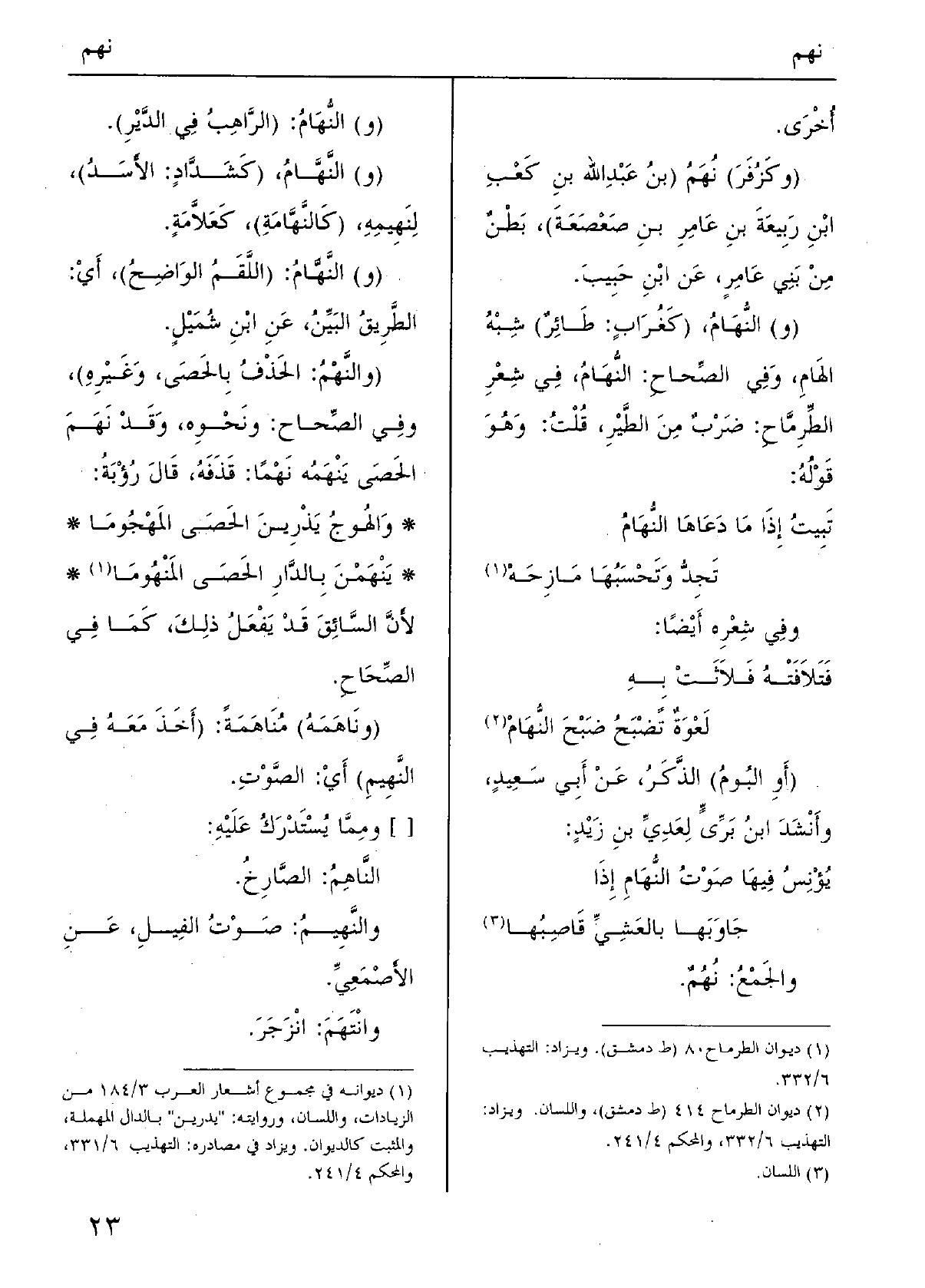 والجَمُعُ: نُهُمٌ. (و) النُّهَامُ: (الرَّاهِبُ فِي الدَّبْرِ) . (و) النَّهَّامُ، (كَشَدَّادٍ: الأَسَدُ) ، لِنَهِيمِهِ، (كَالنَّهَّامَةِ، كَعَلاَّمَةٍ. (و) النَّهَّامُ: (اللَّقَمُ الوَاضِحُ) ، أَيْ: الطَّريِقُ البَيِّنُ، عِنِ ابْنِ شُمَيْلٍ. (والنَّهْمُ: الحَذْفُ بِالحَصَى، وَغَيْرِهِ) ، وفِي الصِّحاح: ونَحْوِه، وَقَدْ نَهَمَ الحَصَى يَنْهُمُه نَهْماً: قَذَفَهُ، قَالَ رُؤْبَةُ: