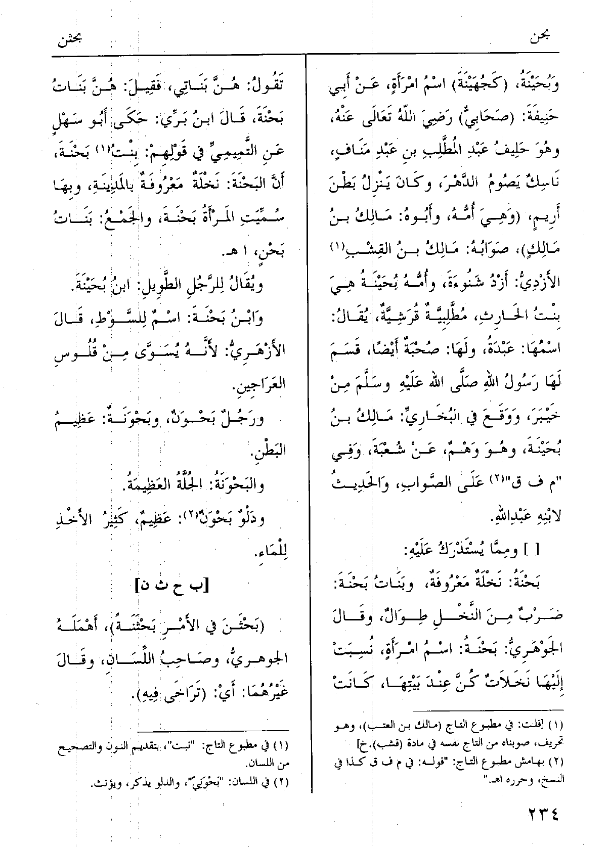 وقالَ الجوْهرِيُّ: بَحْنَةُ اسمُ امْرأَةٍ نُسِبَتْ إِلَيْهَا نَخْلاتٌ كُنَّ عنْدَ بَيتِها كانتْ تقولُ: هُنَّ بَناتي، فقيلَ: هُنَّ بَناتُ بَحْنَة.