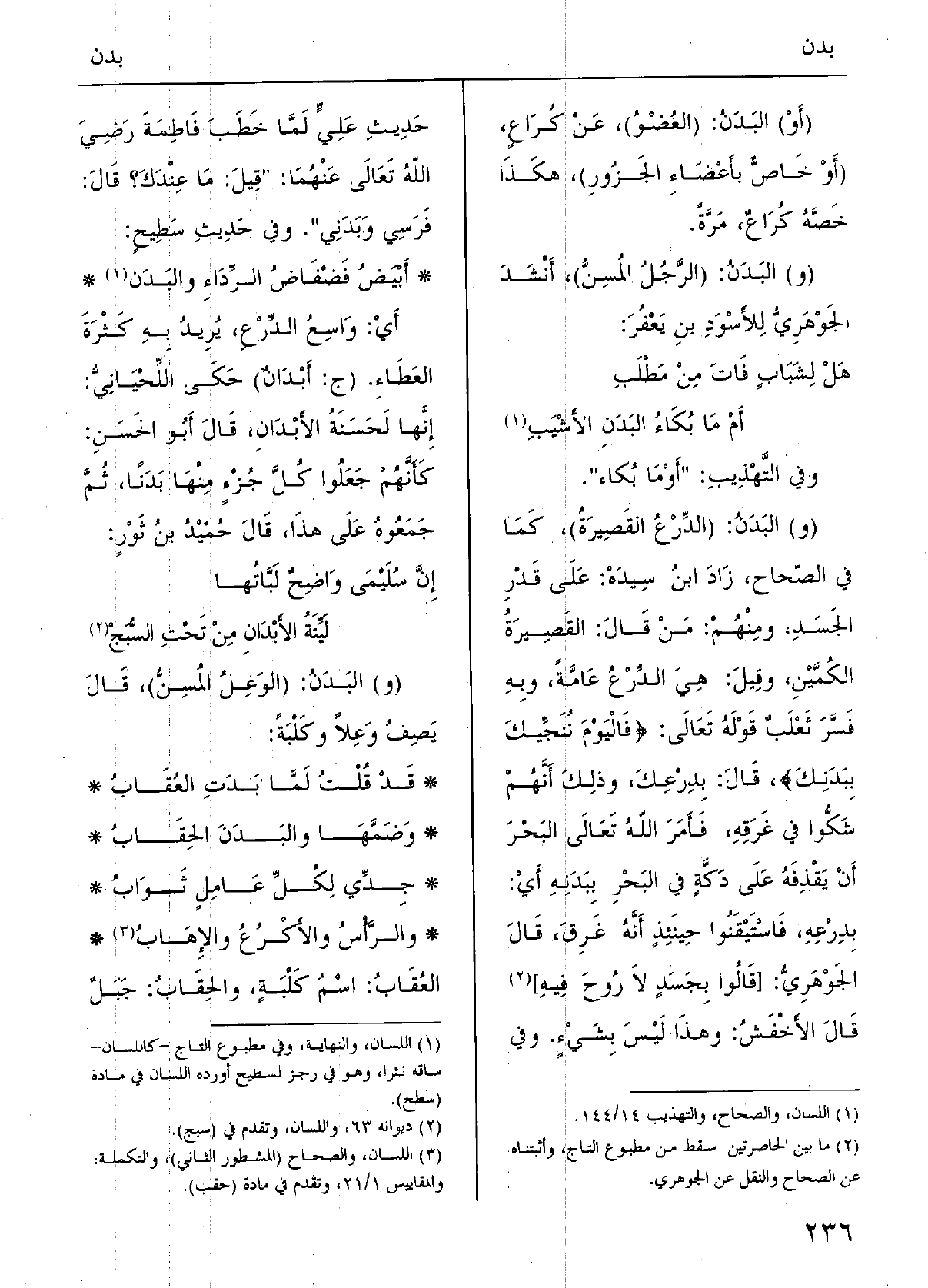 قالَ أَبو الحَسَنِ: كأَنَّهُمْ جَعَلُوا كلّ جُزْءٍ مِنْهَا بَدَناً ثمَّ جَمَعُوه على هَذَا؛ قالَ حُمَيْدُ بنُ ثَوْرٍ: