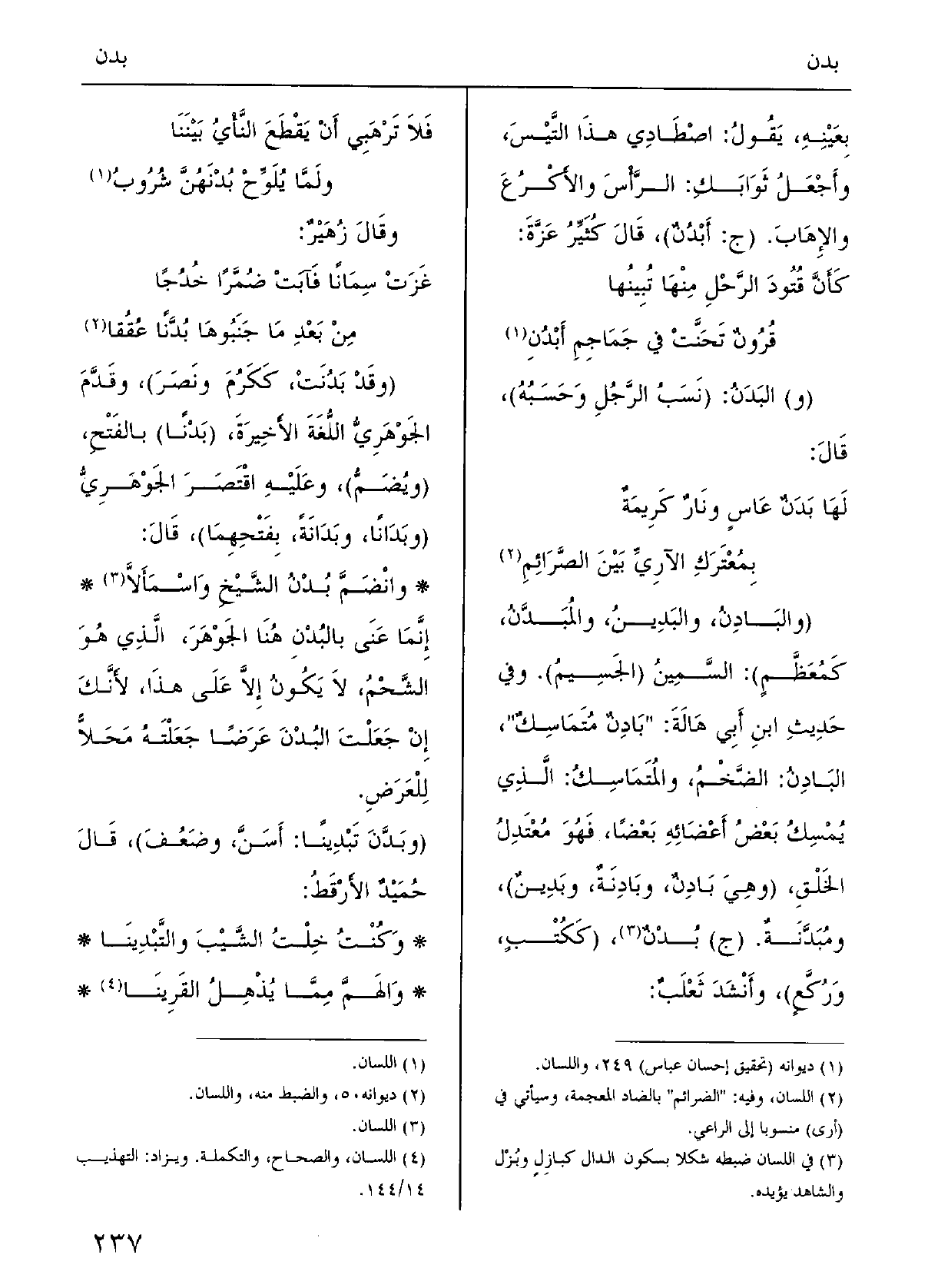 غَزَتْ سِماناً فآبَتْ ضُمّراً خُدُجاً من بَعْدِ مَا جَنَّبوها بُدَّناً عُقُقا (وَقد بَدُنَتْ، ككَرُمَ ونَصَرَ) ، وقدمَ الجوْهرِيُّ اللّغَة الأَخيرَةَ، (بَدْناً) ، بالفتْحِ (ويُضَمُّ) ، وَعَلِيهِ اقْتَصَرَ الجوْهرِيُّ، (وبَداناً وبَدانَةً بفتْحِهما) ؛) قالَ: