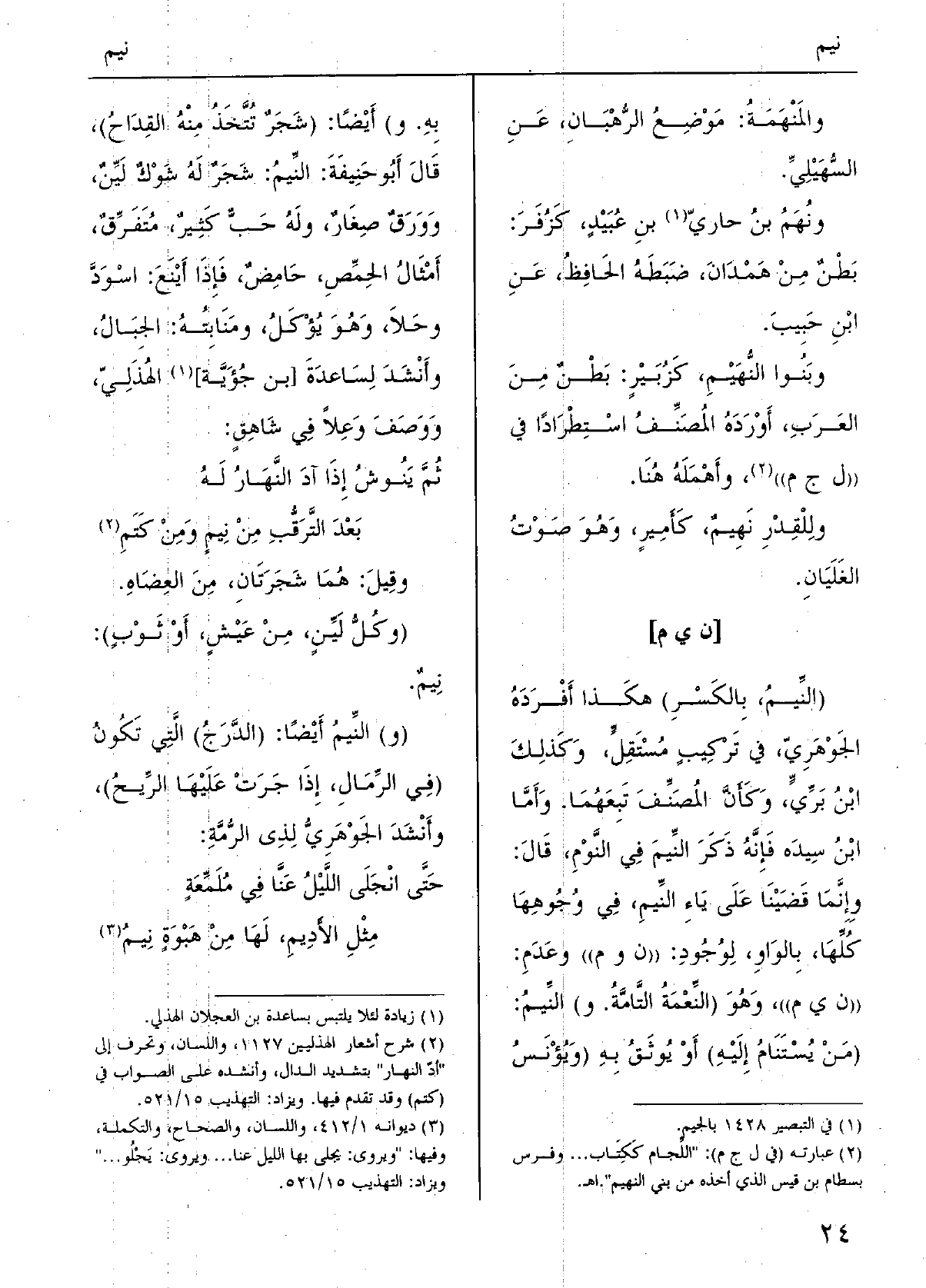 ( {النِّيمُ، بِالْكَسْرِ) هَكَذَا أفرده الْجَوْهَرِي، فِي تركيبٍ مُسْتَقِلٍّ، وَكَذَلِكَ ابْن بَري، وكأنَّ المصنِّف تَبِعَهُما. وَأما ابْن سَيّده فإنَّه ذكر النِّيمَ فِي النَّوْم، قَالَ: وإنَّما قضينا على يَاء النِّيمِ، فِي وُجوهِها كُلِّها، بِالْوَاو، لوُجُود: ((ن وم)) وَعدم: ((ن ي م)) ، وَهُوَ (النِّعمَةُ التَّامَّة. و)) النِّيمُ: (من} يُسْتَنام إِلَيْهِ) أَو يُوثَقُ بِهِ (ويُؤنسُ بِهِ. و) أَيْضا: (شَجَرٌ تُتَّخذ مِنْهُ القِداحُ) قَالَ أَبُو حنيفَة: النِّيمُ: شجرٌ لَهُ شوكٌ لَيِّن، وورقٌ صِغارٌ، وَله حَبٌّ كثيرٌ، متفرقٌ، أَمْثَال الحِمِّصِ، حامِضٌ، فَإِذا أينع: اسودَّ وحلا، وَهُوَ يُؤكَلُ، ومنابته: الجبالُ، وَأنْشد لساعدة [بن جُؤيَّة] الهُذليّ، وَوصف وَعلا فِي شَاهِق: