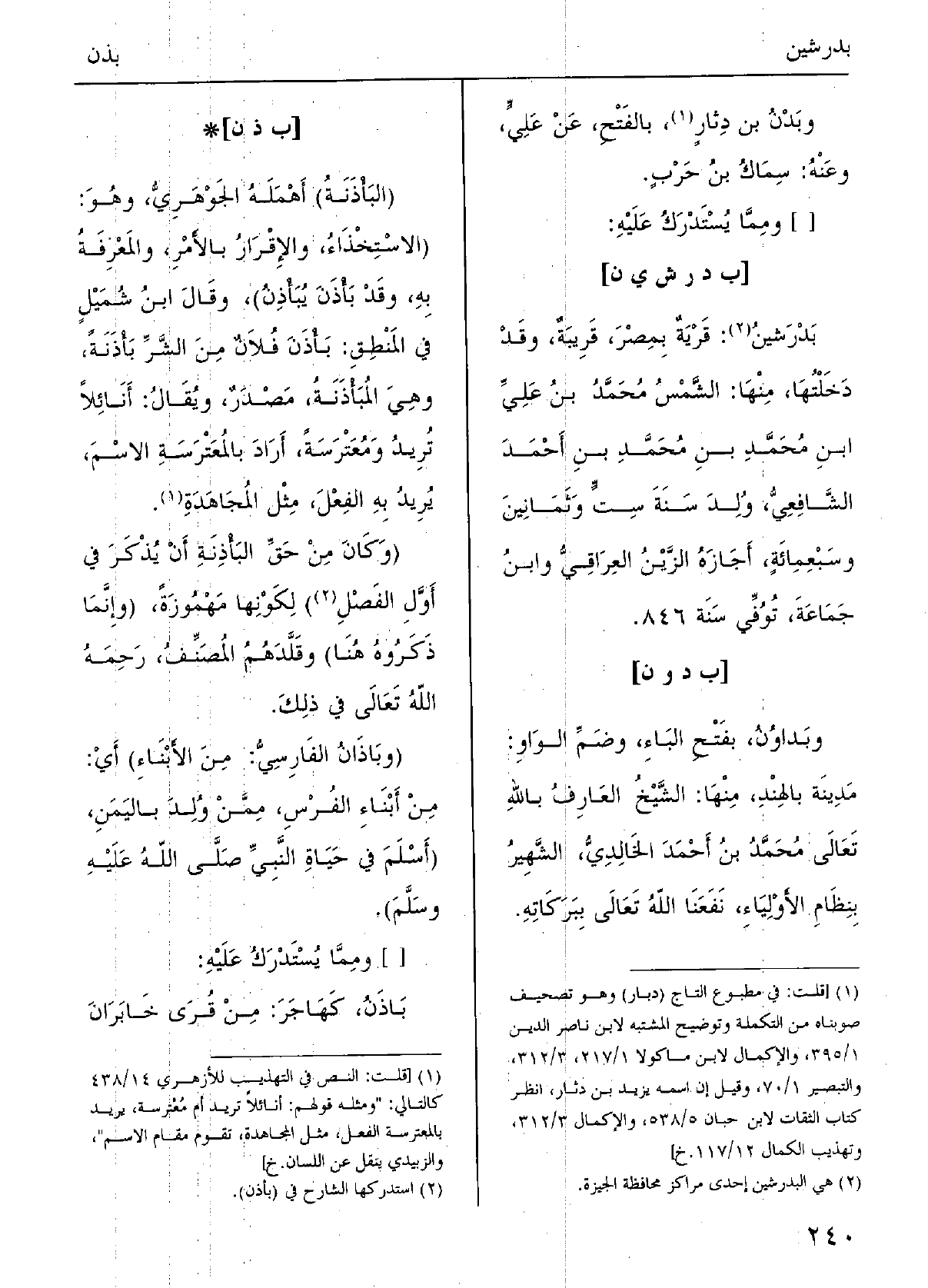 :) بدرشين: قرْيَةٌ بمِصْرَ قَرِيبَةٌ، وَقد دَخَلْتُها، مِنْهَا: الشمسُ محمدُ بنُ عليِّ بنِ محمدِ بنِ محمدِ بنِ أَحمدَ الشافِعِيُّ وُلِدَ سَنَة ستَ وثَمانِين وسَبْعمائةٍ، أَجازَهُ الزَّيْن العِراقيُّ وابنُ جماعَةَ، تُوفي سَنَة 846.
