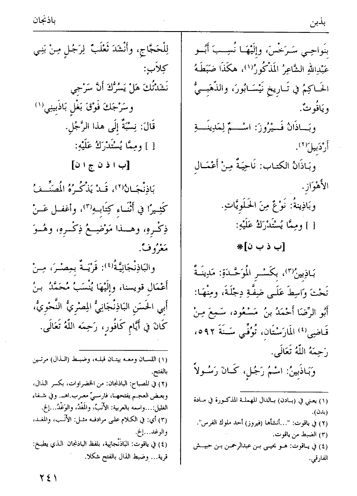 :) باذَنْجانُ: قد يَذْكُرُه المصنِّفُ كثيرا فِي أَثناءِ كتابِهِ، وأغفل عَن ذِكْرِه، وَهَذَا موْضِعُ ذِكْرِه، وَهُوَ مَعْروفٌ.