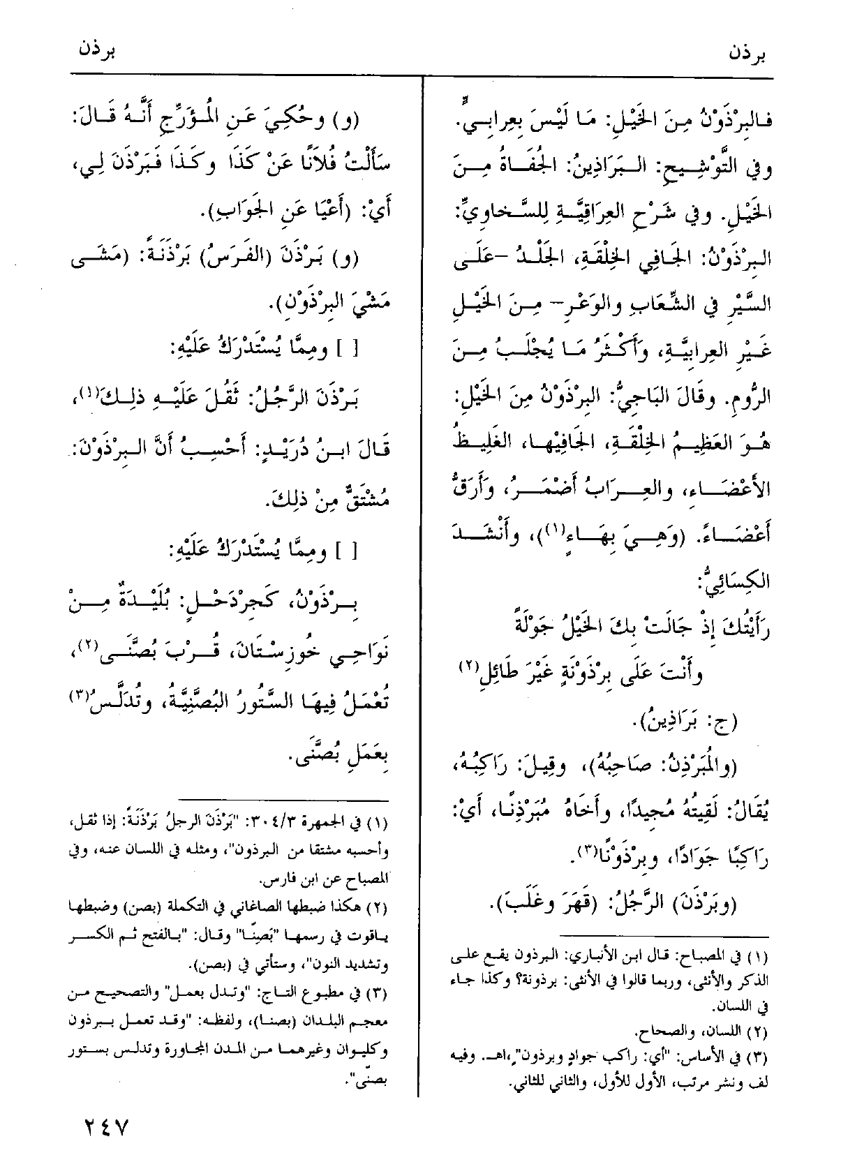 قالَ ابنُ دُرَيْدٍ: أَحسِبُ أنَّ البِرْذَوْنَ مُشْتقٌّ من ذَلِك.