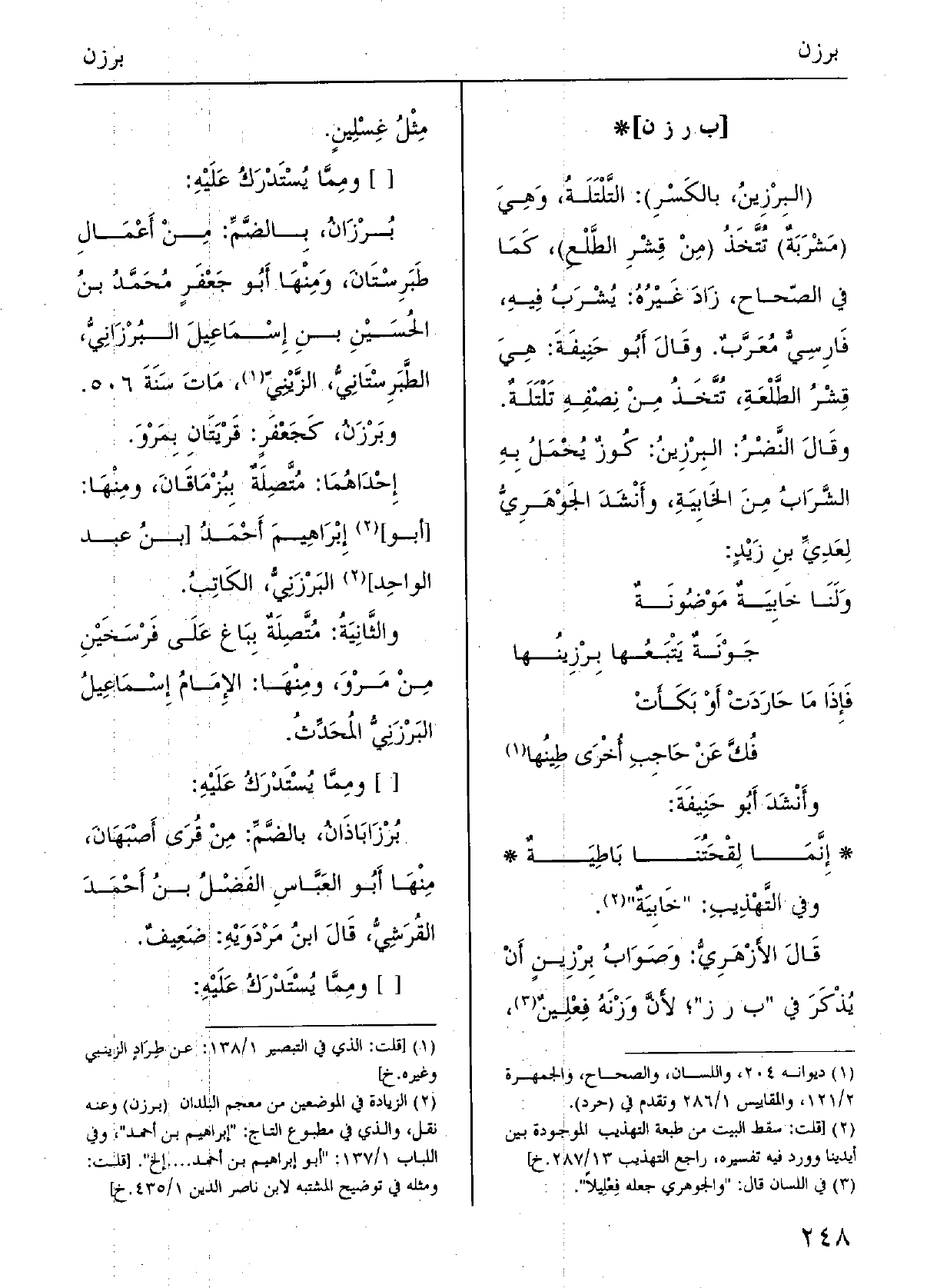 قالَ الأَزْهرِيُّ: وصَوابُ برْزينٍ أنْ يُذْكَرَ فِي بَرَزَ، لأنَّ وَزْنَه فِعْلينٌ مِثْل غِسْلِين.