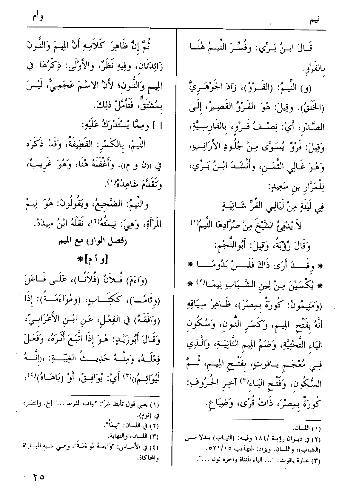 قَالَ ابنُ بَرِّي: وفُسِّرَ النِّيمُ هُنَا بِالفَرْو. (و) النِّيمُ: (الفَرْوُ) ، زَادَ الجَوْهَرِيُّ (الخَلَقُ) . وقِيلَ: هُوَ الفَرْوُ القَصِيرُ، إِلَى الصَّدْرِ، أَيْ: نِصْفُ فَرْوٍ، بِالفَارسِيَّةِ، وَقِيلَ: فَرْوٌ يُسَوَّى مِنْ جُلُودِ الأَرَانِبِ، وَهُوَ غَالِي الثَّمَن، وأَنْشَدَ ابْنُ بَرِّي، لِلْمَرَّارِ بنِ سَعِيدٍ: فِي لَيْلَةٍ مِنْ لَيَالِي القُرِّ شَاتِيَةٍ لاَيُدْفِئُ الشَّيْخَ مِنْ صُرَّادِهَا النِّيمُ وَقَالَ رُؤْبَةُ، وَقِيلَ: أَبُو النَّجْمِ: وِقْدَ أَرَى ذَاكَ فَلَنْ يَدُومَا يُكْسَيْنَ مِنْ لِينِ الشَّبَابِ {نِيمَا (} وَمَنِيمُونُ: كُوَرةٌ بِمِصْرَ) ، ظَاهِرُ سِيَاقِهِ أنَّهُ بِفَتْحِ المِيمِ، وَكَسْرِ النُّونِ، وَسُكُونِ اليَاءِ التَّحْتِيَّةِ، وضَمِّ المِيمِ الثَّانِيَةِ، وَالَّذِي فِي مُعْجَمِ ياقوتٍ، بِفَتْحِ المِيم، ثُمَّ السُّكُونِ، وَفَتْحِ اليَاءِ آخِرِ الحُرُوفِ: كُورَةٌ بِمِصْرَ، ذَاتُ قَرًى، وَضِيَاعٍ. ثُمَّ إِنَّ ظَاهِرَ كَلاَمِهِ أَنَّ المِيمَ وَالنُّونَ زَائدَتَانِ، وفِيهِ نَظَرٌ، والأَوْلَى: ذِكْرُهَا فِي المِيمِ وَالنُّونِ؛ لأَنَّ الاسْمَ عَجَمِيُّ، لَيْسَ بِمُشْتَقٍّ، فَتَأَمَّلْ ذِلَكَ. [] ومِمَّا يُسْتَدْرَكُ عَلَيْهِ: النِّيمُ، بِالكَسْرِ: القَطِيفَةُ، وَقَدْ ذَكَرَه فِي ((ن وم)) . وَأَغْفَلَهُ هُنَا، وَهُوَ غَرِيبٌ. وَتَقَدَّمَّ شَاهِدُهُ. {والنِّيمُ: الضَّجيعُ، ويُقُولُونَ: هُوَ نِيمُ المَرْأَةِ، وَهِيَ:} نِيمَتُهُ، نَقَلَهُ ابْن سِيدَه.