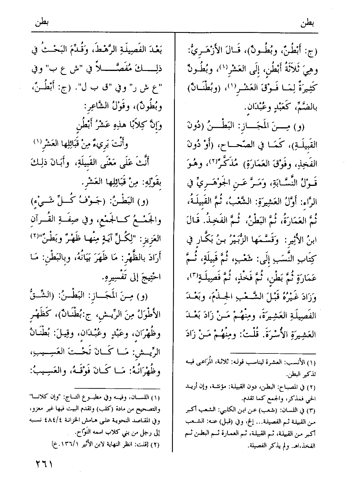 (و) مِن المجازِ: البَطْنُ (دونَ القَبيلةِ) ؛) كَمَا فِي الصِّحاحِ؛ (أَو دونَ الفَخِذِ وفَوْقَ العِمارَةِ) ، مُذَكَّر. وَهُوَ قَوْلُ النَّسَّابَة.