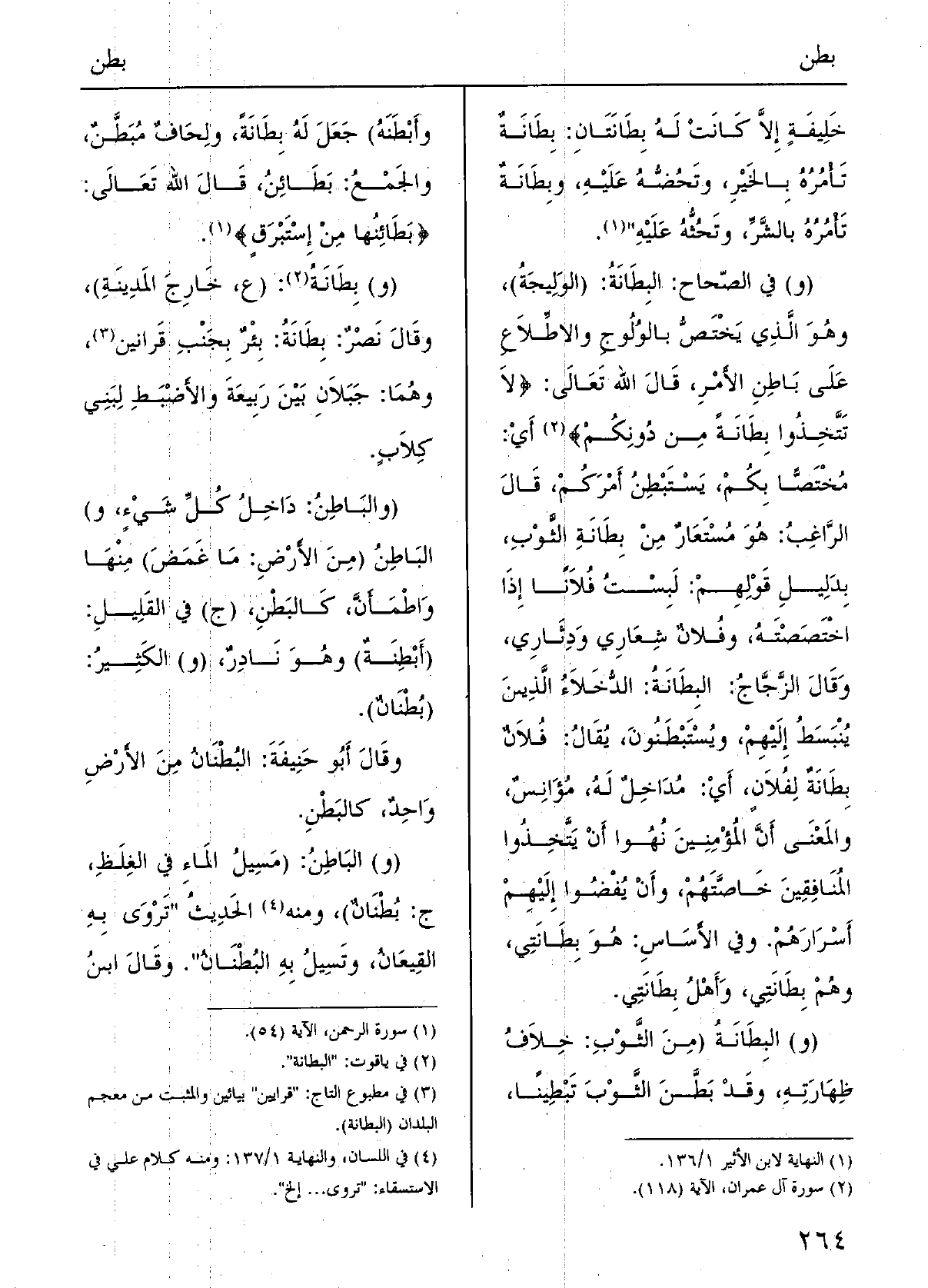 (وقالَ نَصْر: بطانَةُ: بِئْرٌ بجنبِ قرايين وهُما جَبَلان بينَ رَبيعَةَ والأضْبَط لبَني كِلابٍ.