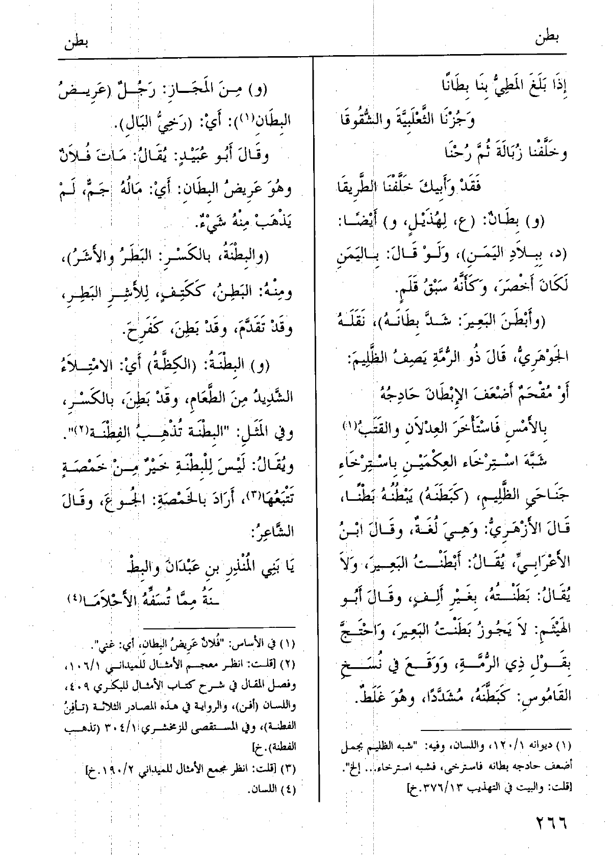 أَو مُقْحَم أَضْعَفَ الإِبْطانَ حادِجُهبالأَمسِ فاسْتَأْخَرَ العِدْلانِ والقَتَبُشَبَّه اسْتِرْخاء العِكْمَيْن باسْتِرْخاء جَناحَيِ الظَّليم. (كبَطَّنَهُ) يُبَطّنُه بَطناً.