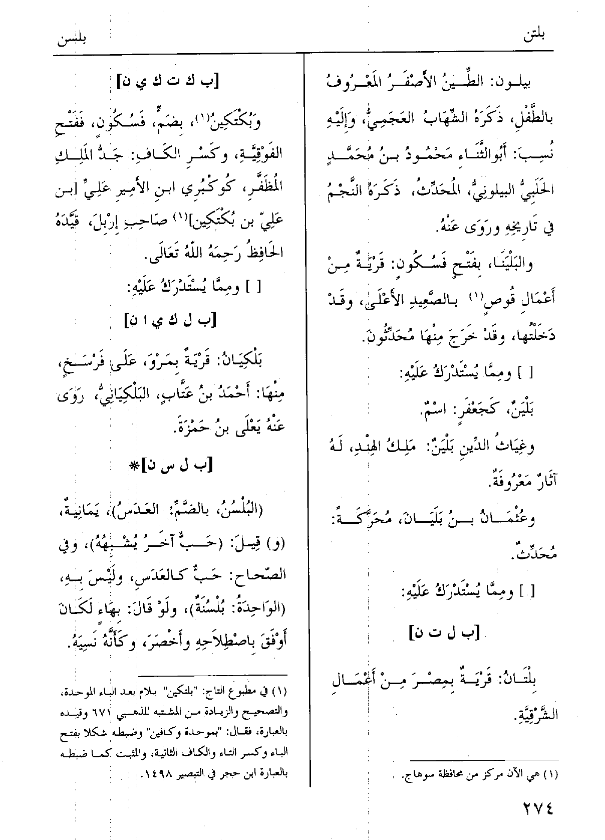 :) بَلْكِيانُ: قَرْيَةٌ بمَرْوَ على فَرْسَخ، مِنْهَا: أَحمدُ بنُ عتَّاب البَلْكِيانيُّ؛ رَوَى عَنهُ يَعْلَى بنُ حَمْزَةَ.