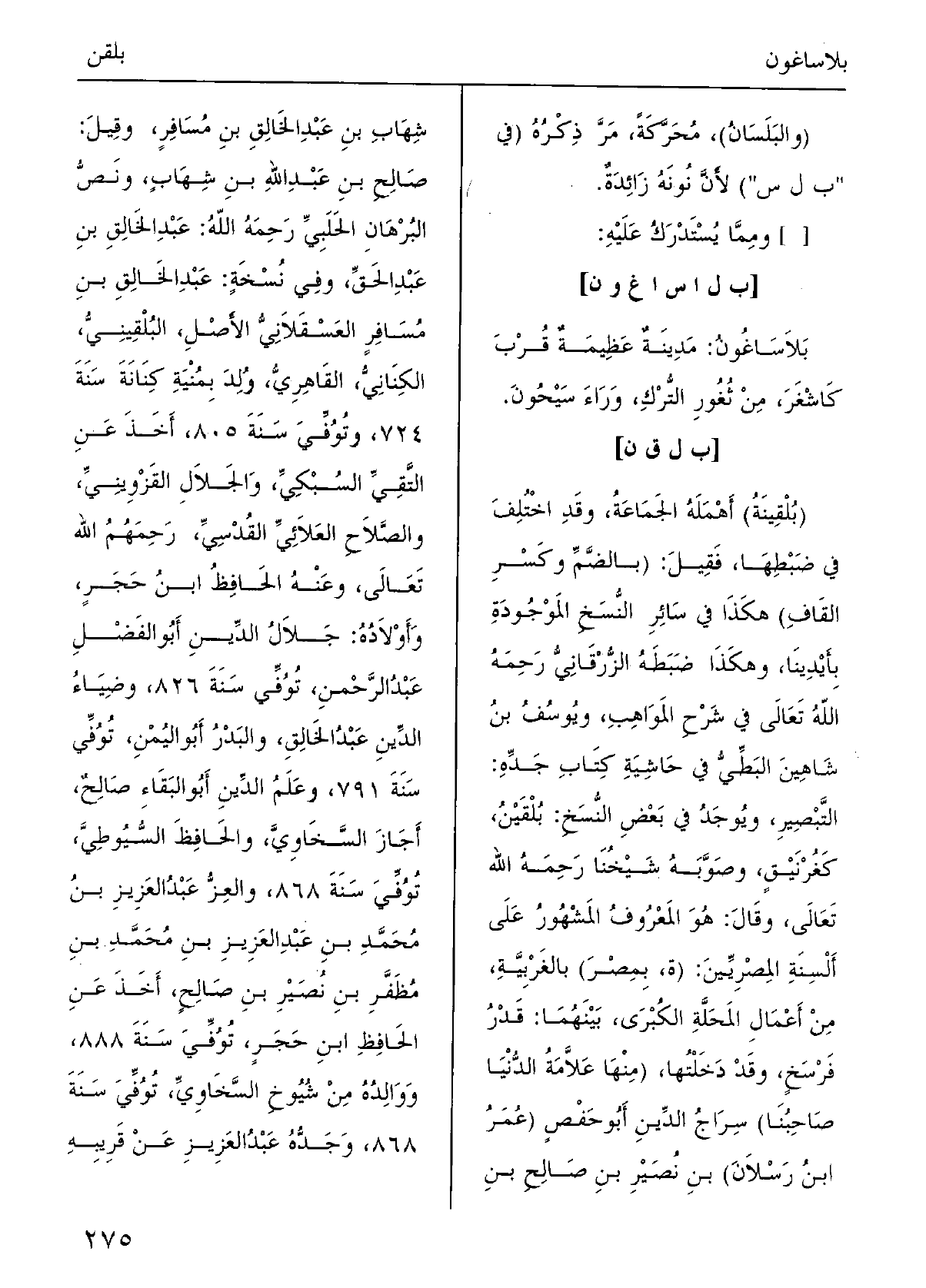 : (بَلاساغُون: مَدينَةٌ عَظيمةٌ قُرْبَ كاشغَر مِن ثُغورِ التُّرْكِ وَرَاء سيحون.