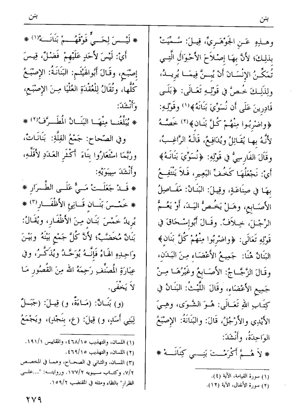 وقالَ أَبو الهَيْثم: {البَنانَةُ: الإصْبَعُ كلُّها، وتقالُ للعُقْدةِ العُلْيا مِنَ الإصْبَعِ؛ وأَنْشَدَ: