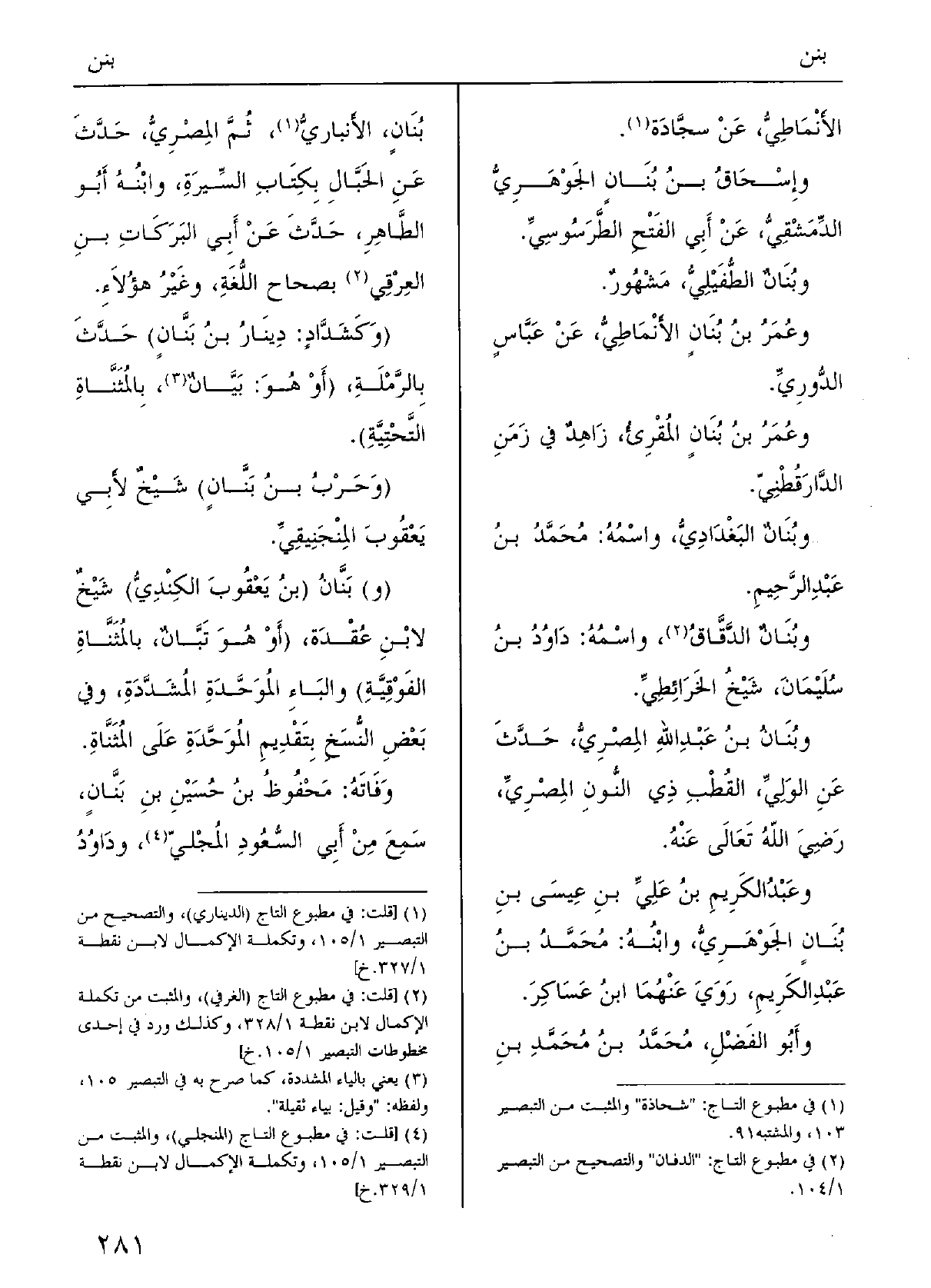 الأَنْماطيُّ عَن شحادَةَ؛ وإسحاقُ بنُ بُنانٍ الجوْهرِيُّ الدِّمَشْقيُّ عَن أبي الفتْحِ الطرسوسيُّ؛ وبُنانٌ الطُّفَيْليُّ مَشْهورٌ؛ وعُمَرُ بنُ بُنانٍ الأَنْماطيُّ عَن عبَّاس الدُّوريُّ؛ وعُمَرُ بنُ بُنانٍ المُقْرىءُ زاهِدٌ فِي زَمَنِ الدَّارْقطْنيُّ؛ وبُنانٌ البَغْدادِيُّ واسْمُه محمدُ بنُ عبدِ الرَّحيم؛ وبُنانٌ الدفان واسْمُه دَاودُ بنُ سُلَيْمان شيخُ الخَرائِطِيّ؛ وبُنانُ بنُ عبدِ اللَّهِ المِصْريُّ حدَّثَ عَن الْوَلِيّ القطب ذِي النُّون المِصْرِيّ، رضِيَ اللَّهُ تَعَالَى عَنهُ؛ وعبدُ الكَريمِ بنُ عليِّ بنِ عيسَى بنِ بُنانٍ الجوْهرِيُّ وابْنُه محمدُ بنُ عبدِ الكَرِيمِ رَوَى عَنْهُمَا ابنُ عَسَاكِر؛ وأَبو الفضْلِ محمدُ بنُ محمدِ بنِ بُنانٍ الدِّينارِيُّ ثمَّ المِصْريُّ حدَّثَ عَن الحبَّال بكتابِ الِّسيرَةِ وابْنُه أَبو الطاهِرِ حدَّثَ عَن أَبي البَرَكات بنِ الغرفى بصِحاحِ اللُّغَةِ، وغيرُ هَؤُلَاءِ.