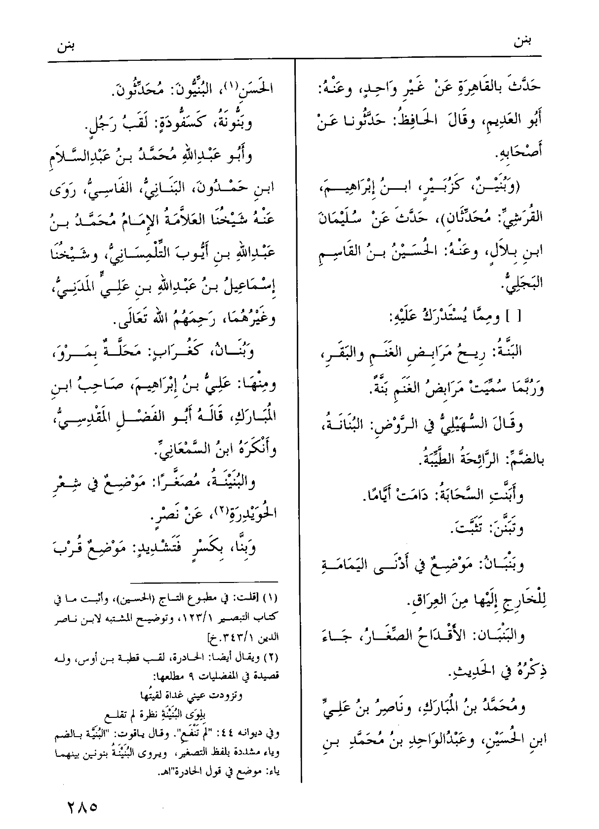 } وبُنانُ، كغُرابٍ: محلَّةٌ بمَرْوَ، وَمِنْهَا: عليُّ بنُ إبراهيمَ صاحِبُ ابنِ المُبارَك، قالَهُ أَبو الفَضْلِ المَقْدسيّ وأَنْكَرَه ابنُ السّمعانيّ.