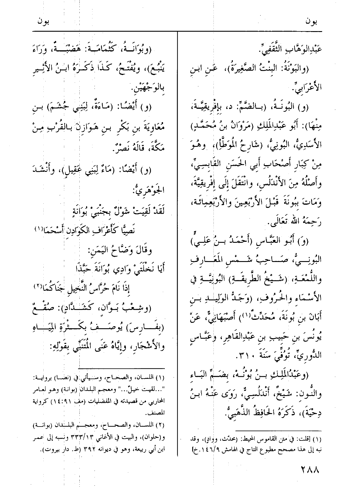 (و) } البُونَةُ، (بالضَّمِّ: د بإِفْرِيقيَةَ، مِنْهَا) :) أَبو عبدِ المَلِكِ (مَرْوانُ بنُ محمدٍ) الأسَدِيُّ البُونيُّ (شارِحُ المُوَطَّأِ) وَهُوَ مِن كِبارِ أَصْحابِ أَبي الحَسَنِ القابِسيّ، وأَصْله مِن الأنْدَلُسِ وانْتَقَلَ إِلَى أَفْرِيقيةَ وماتَ ببُونَةَ قَبْل الأَرْبَعِينَ والأَرْبَعمائَةِ، رحِمَه اللَّهُ تَعَالَى.