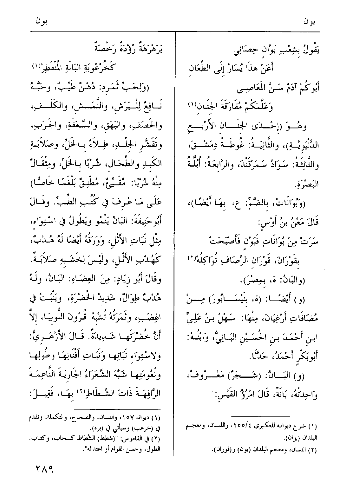 يَقولُ بشِعْبِ بَوَّانٍ حِصاني أَعَنْ هَذَا يُسارُ إِلَى الطِّعانِ؟ أَبوكُمْ آدَمٌ سَنَّ المَعاصِيوعَلَّمكُمْ مُفارَقةَ الجِنانِوهو (إحْدَى الجِنانِ الأَرْبَعِ الدُّنْيوِيَّةِ) ، والثَّانِيَةُ: غوطَةُ دِمَشْقَ، والثَّالثةُ: سَوادُ سَمَرْقَنْد، والَّرابعةُ: أبلةُ البَصْرَةِ.