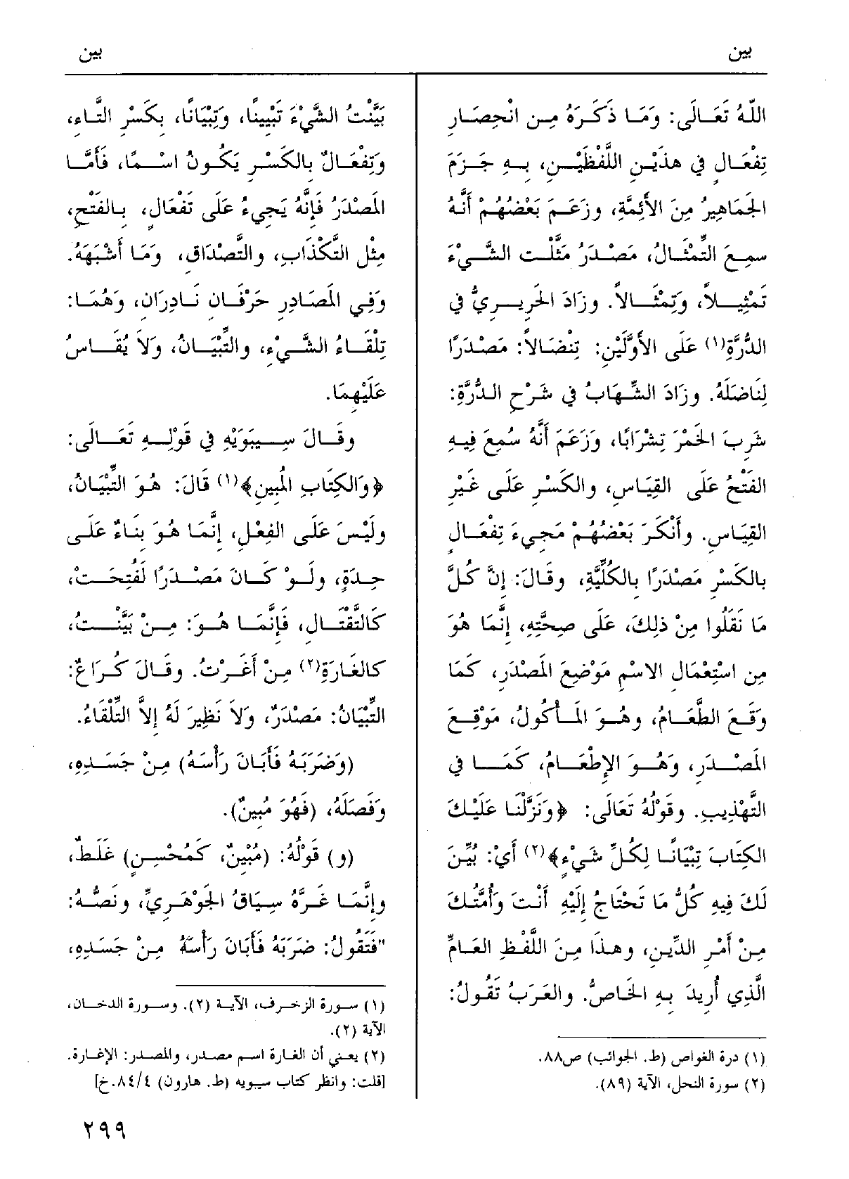 وقوْلُه تَعَالَى: {وأَنْزَلْنا عَلَيْك الكِتابَ {تِبْياناً لكلِّ شيءٍ} ، أَي} بُيِّنَ لكَ فِيهِ كلُّ مَا تَحْتاجُ إِلَيْهِ أَنْتَ وأُمَّتُك مِن أَمْرِ الدِّيْن، وَهَذَا مِن اللَّفْظِ العامِّ الَّذِي أُرِيد بِهِ الخاصُّ، والعَرَبُ تقولُ: بَيَّنْتُ الشيءَ تَبْيِيناً وتِبْياناً، بكسْرِ التاءِ، وتِفْعالٌ، بالكسْرِ يكونُ اسْماً، فأَمَّا المَصْدَرُ فإنَّه يَجِيءُ على تَفْعالٍ بالفتْحِ، مثْلُ التّكْذاب والتَّصْداق وَمَا أَشْبَهه، وَفِي المَصَادِرِ حَرْفان نادِرَان. وهُما تِلْقاء الشَّيْء {والتِّبْيان، وَلَا يقاسُ عَلَيْهِمَا.